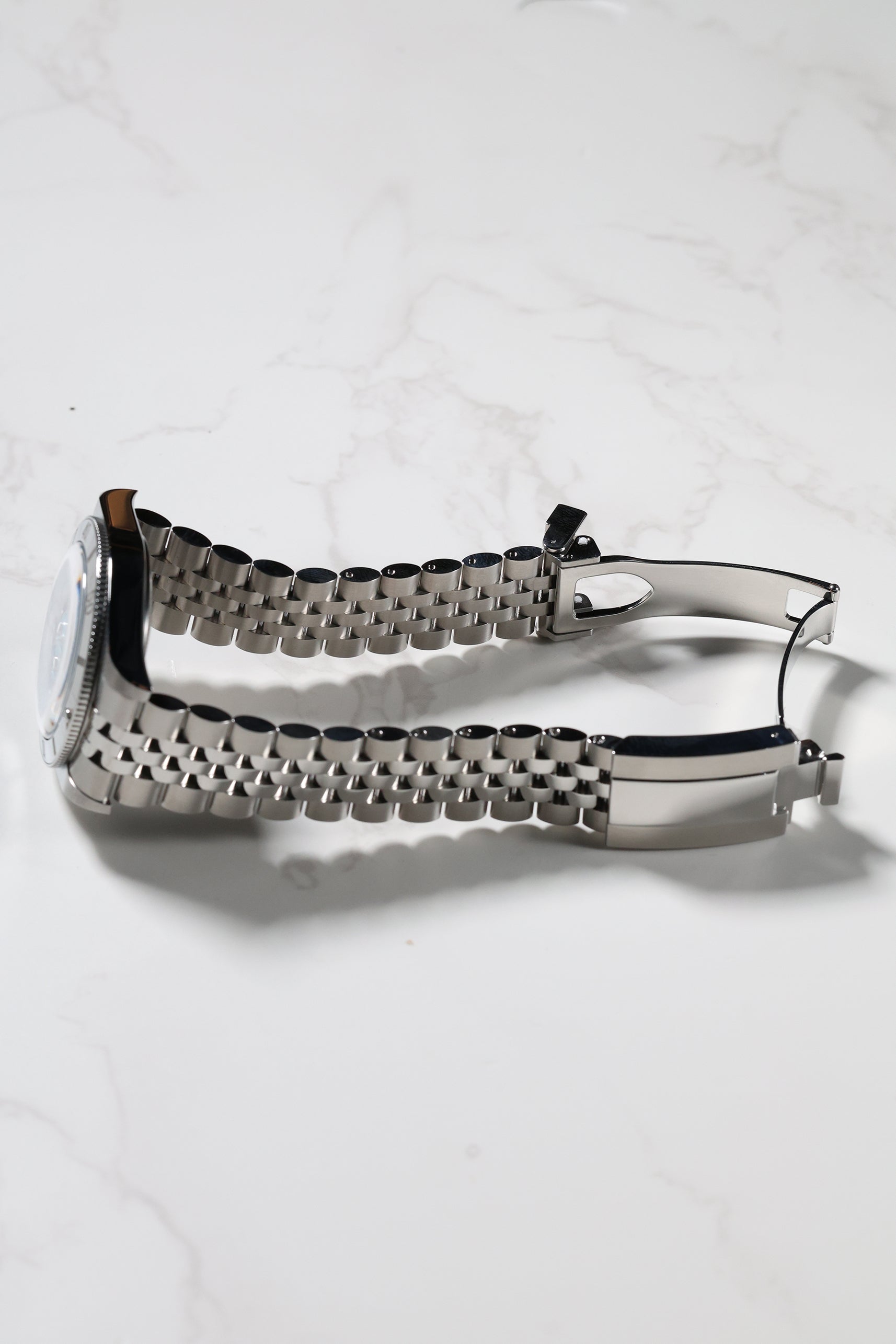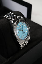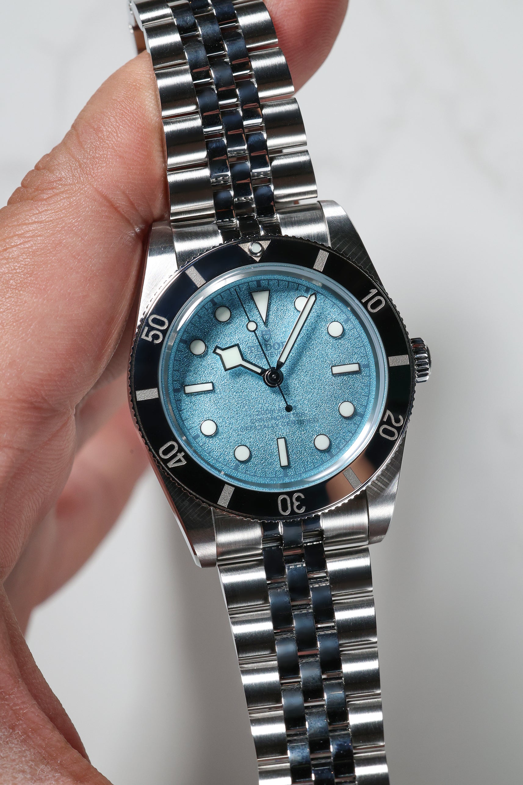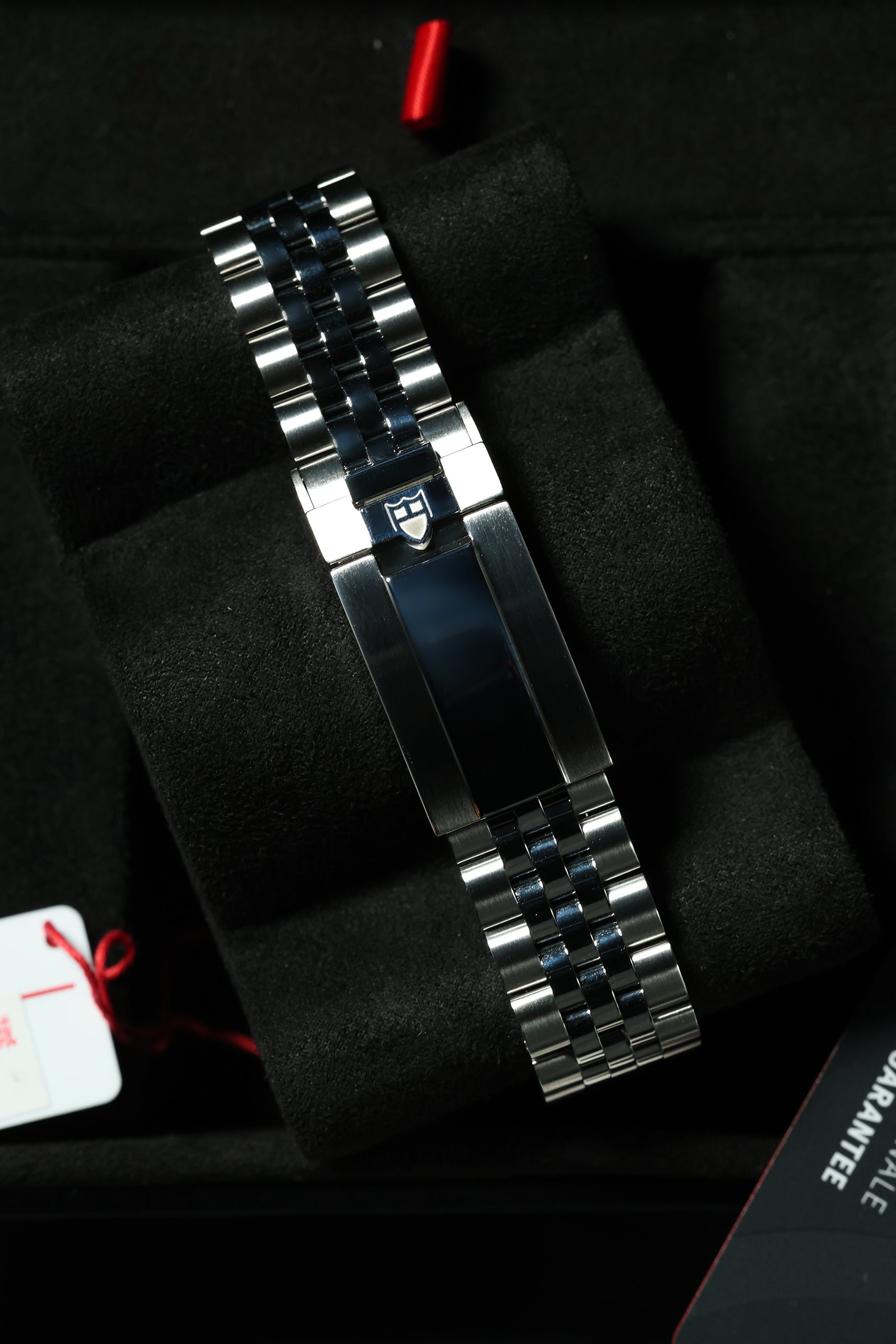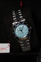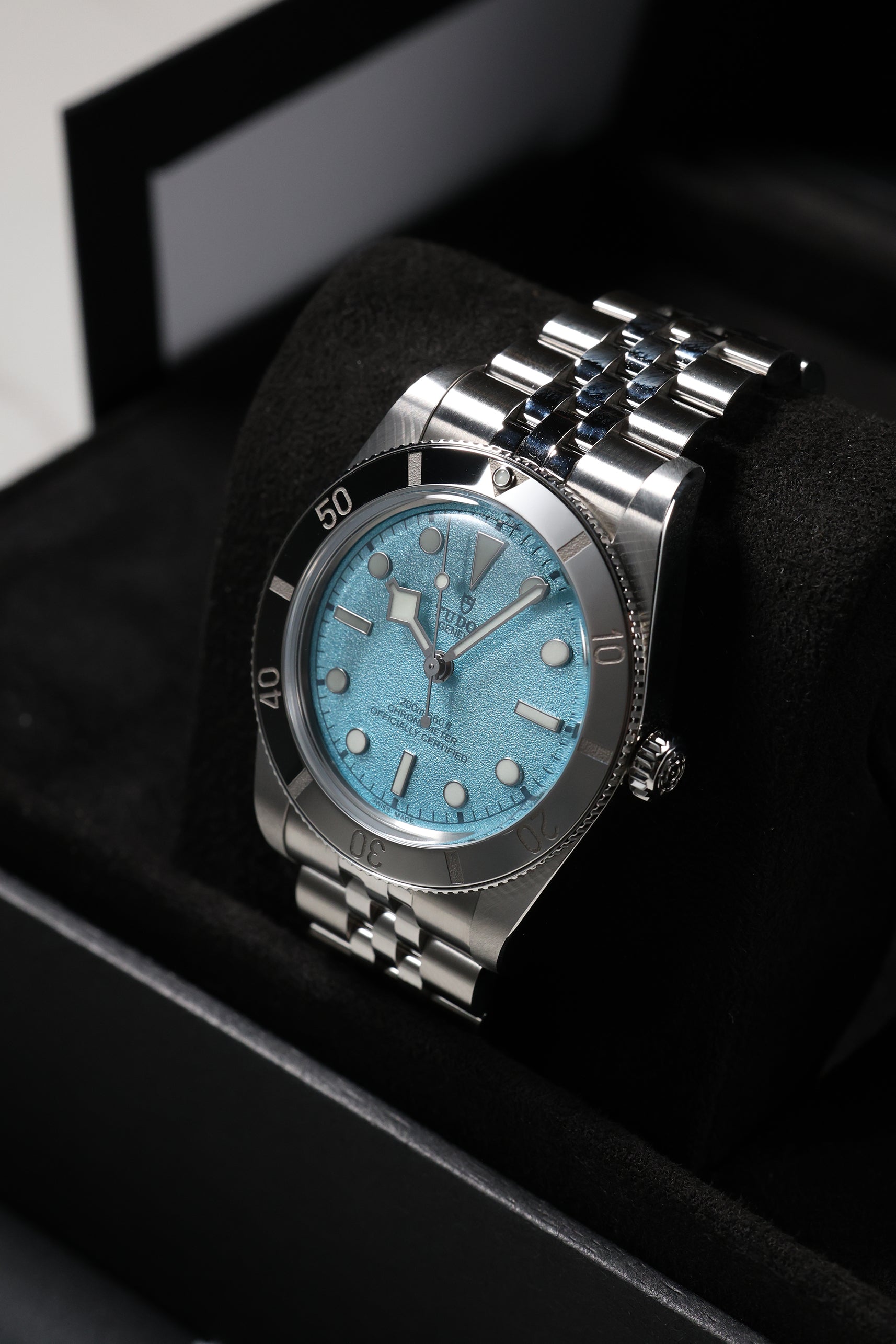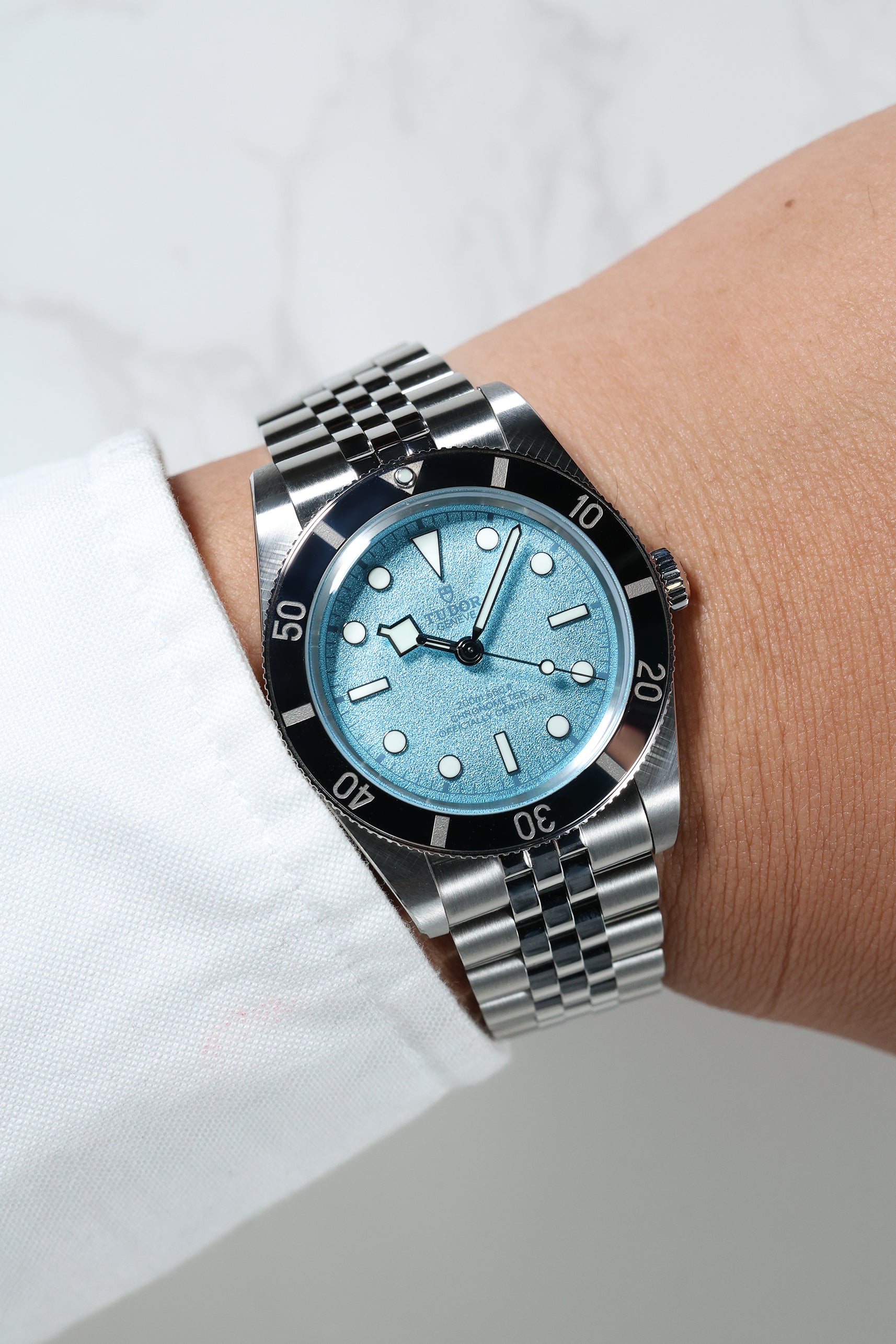 This Black Bay 54 "Blue Lagoon" is expertly fitted with a stainless steel polished and satin-finished five-link bracelet, which provides an exceptionally fluid and comfortable drape on the wrist, complementing its refined aesthetic. Equipped with Tudor’s highly functional T-Fit clasp system for on-the-fly micro-adjustments, the bracelet ensures a perfect fit. The smaller case size and refined design make it a perfectly unisex timepiece that wears elegantly on a wide variety of wrist sizes. By merging retro aesthetics with cutting-edge technology and a refreshing summer-inspired colorway, Tudor has created a watch that appeals to vintage enthusiasts and contemporary collectors alike, destined to become a staple for warm-weather style.