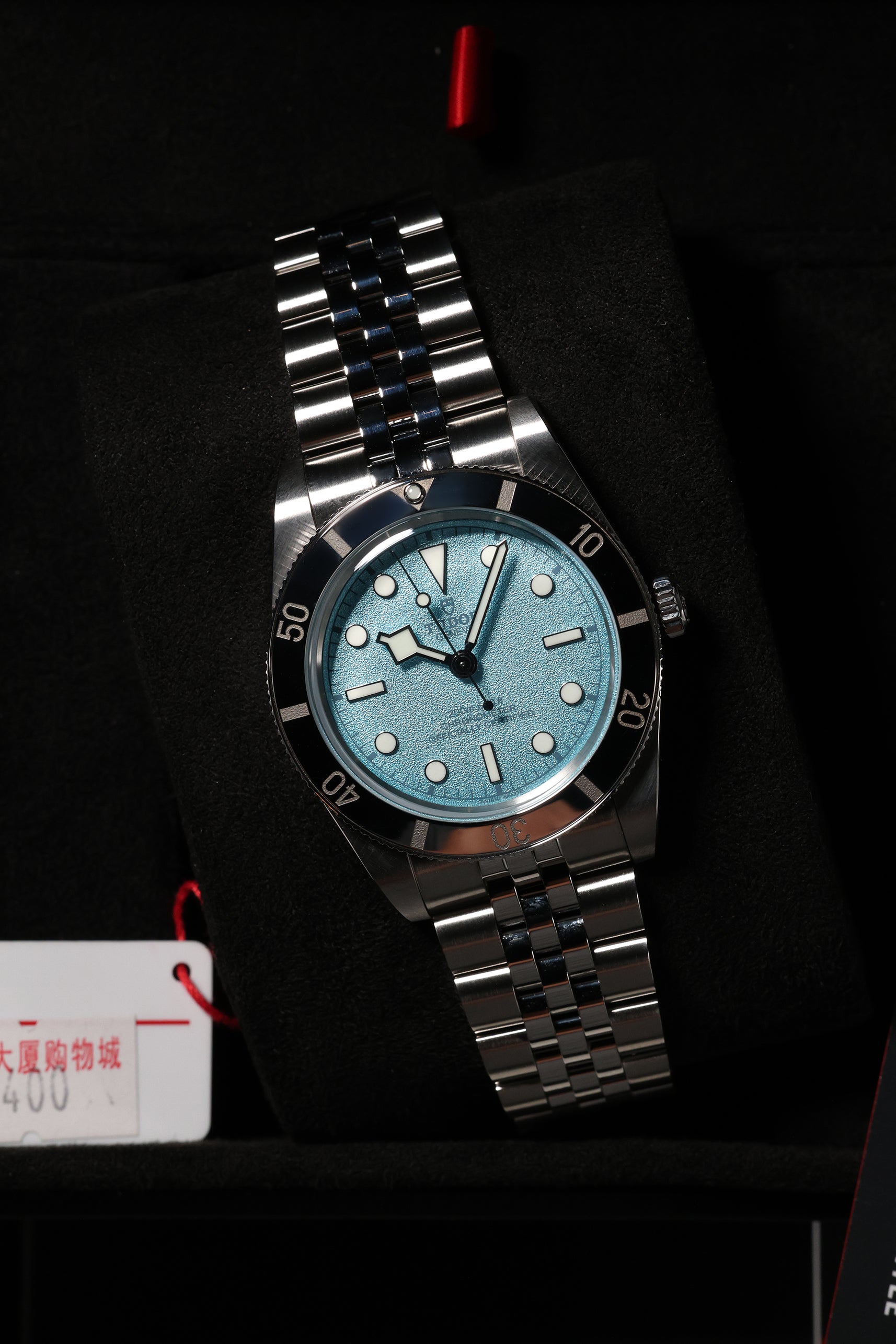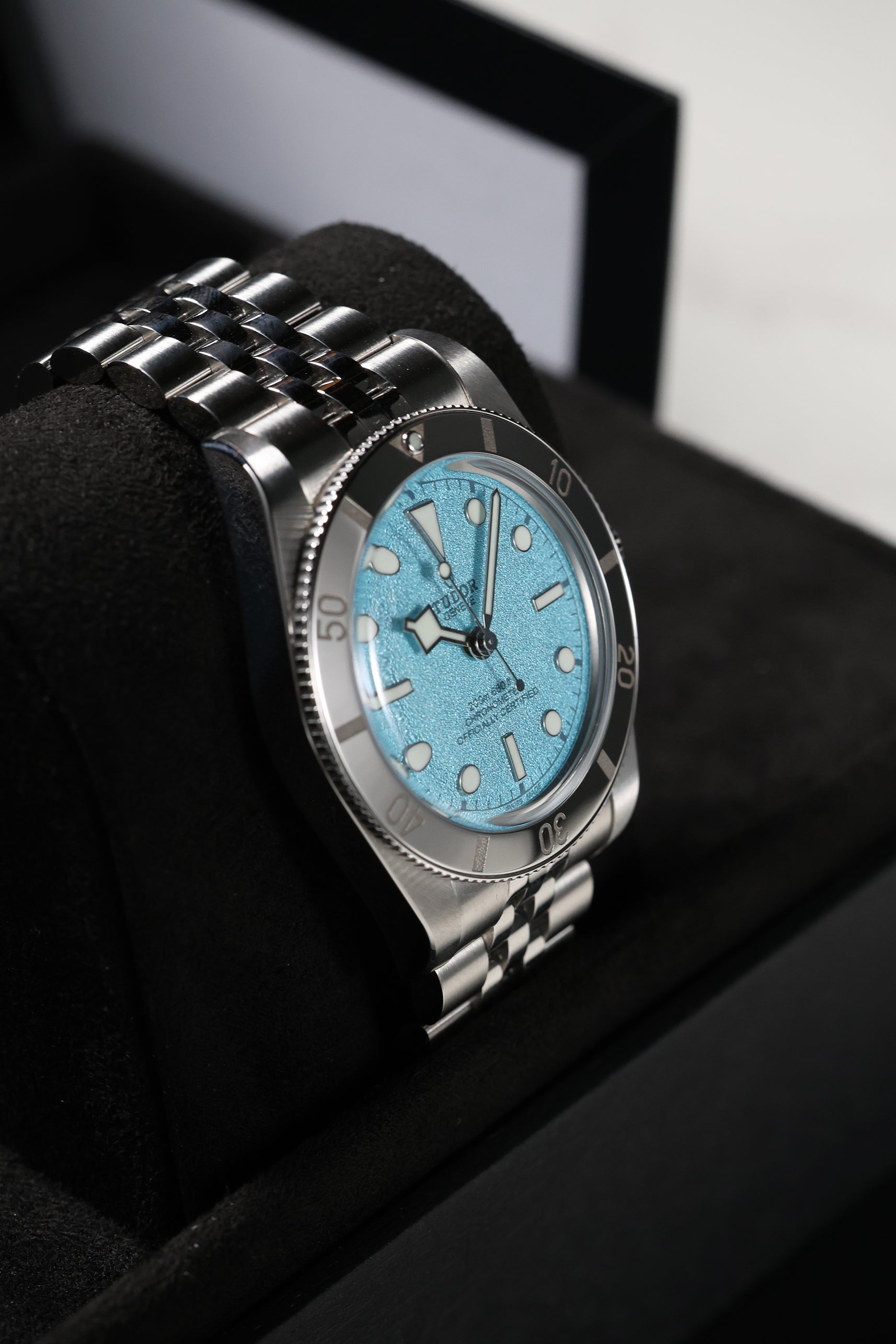 The new Tudor Black Bay 54 "Blue Lagoon" 79000-0001 is a remarkable timepiece that perfectly captures the essence of summer, drawing inspiration from Tudor’s rich diving heritage. Paying homage to the brand’s first dive watch, the 1954 Reference 7922, this latest model, just released prior to summer, is clearly geared for sun-drenched adventures. With its compact 37mm case size, the Black Bay 54 exudes vintage charm while offering modern versatility and a more universally appealing proportion. Its polished and satin-brushed stainless steel case ensures durability while maintaining a sleek, understated aesthetic, now paired exquisitely with a polished steel bezel that adds a sophisticated gleam.