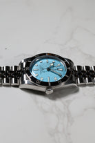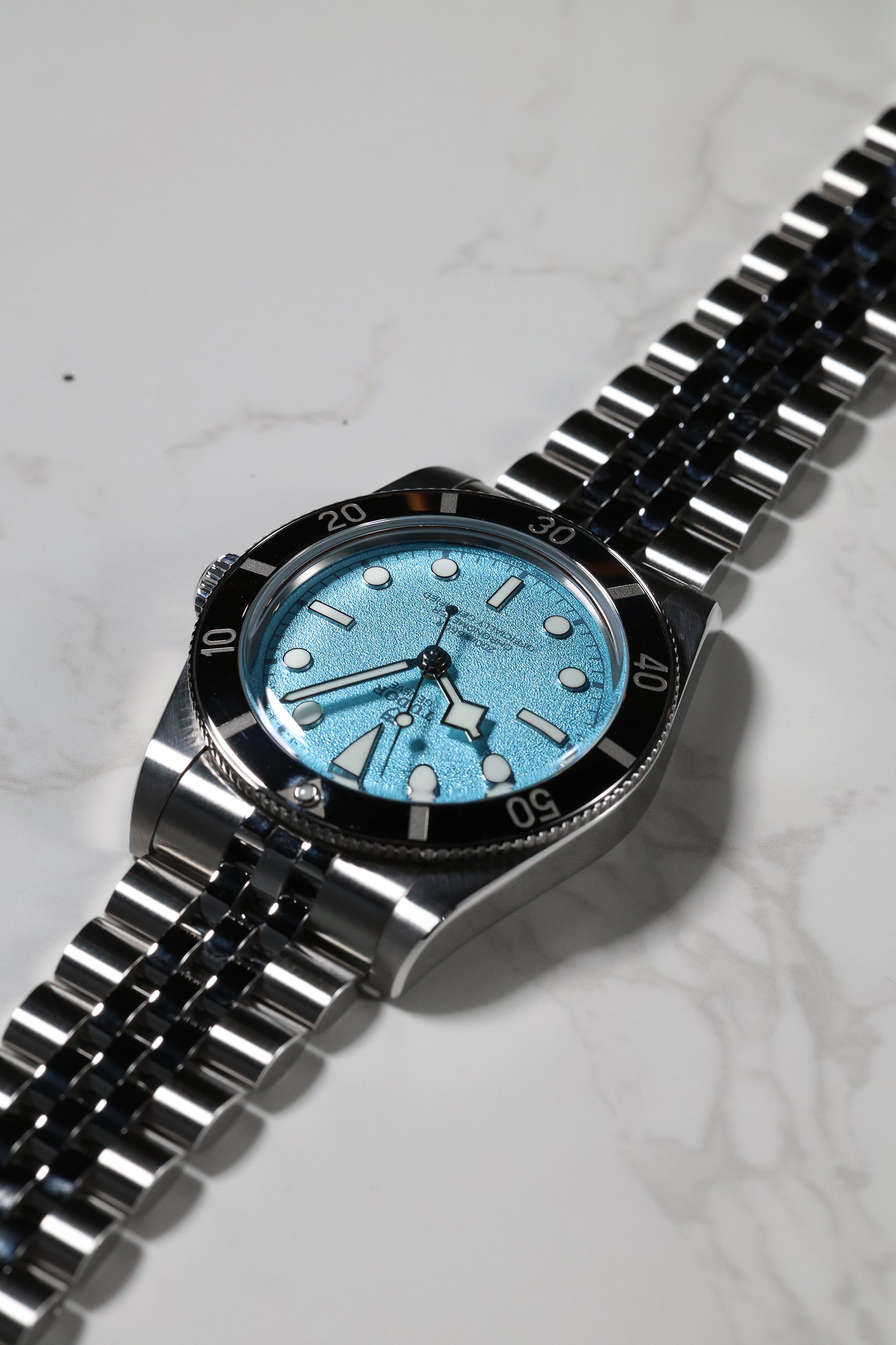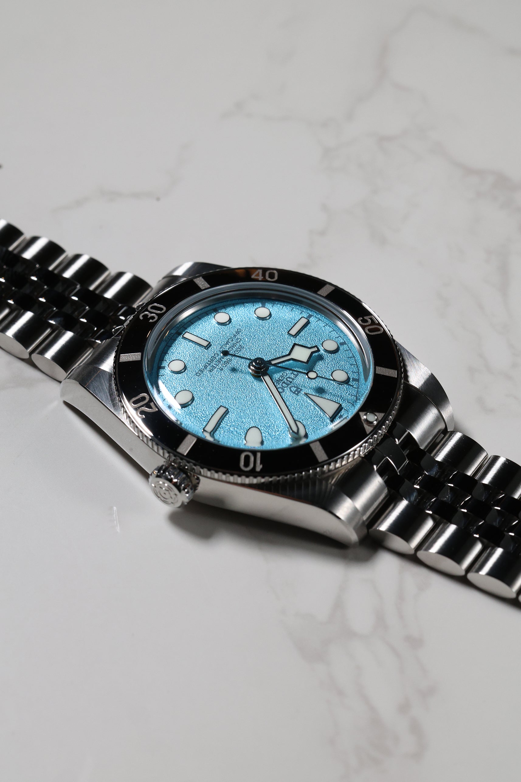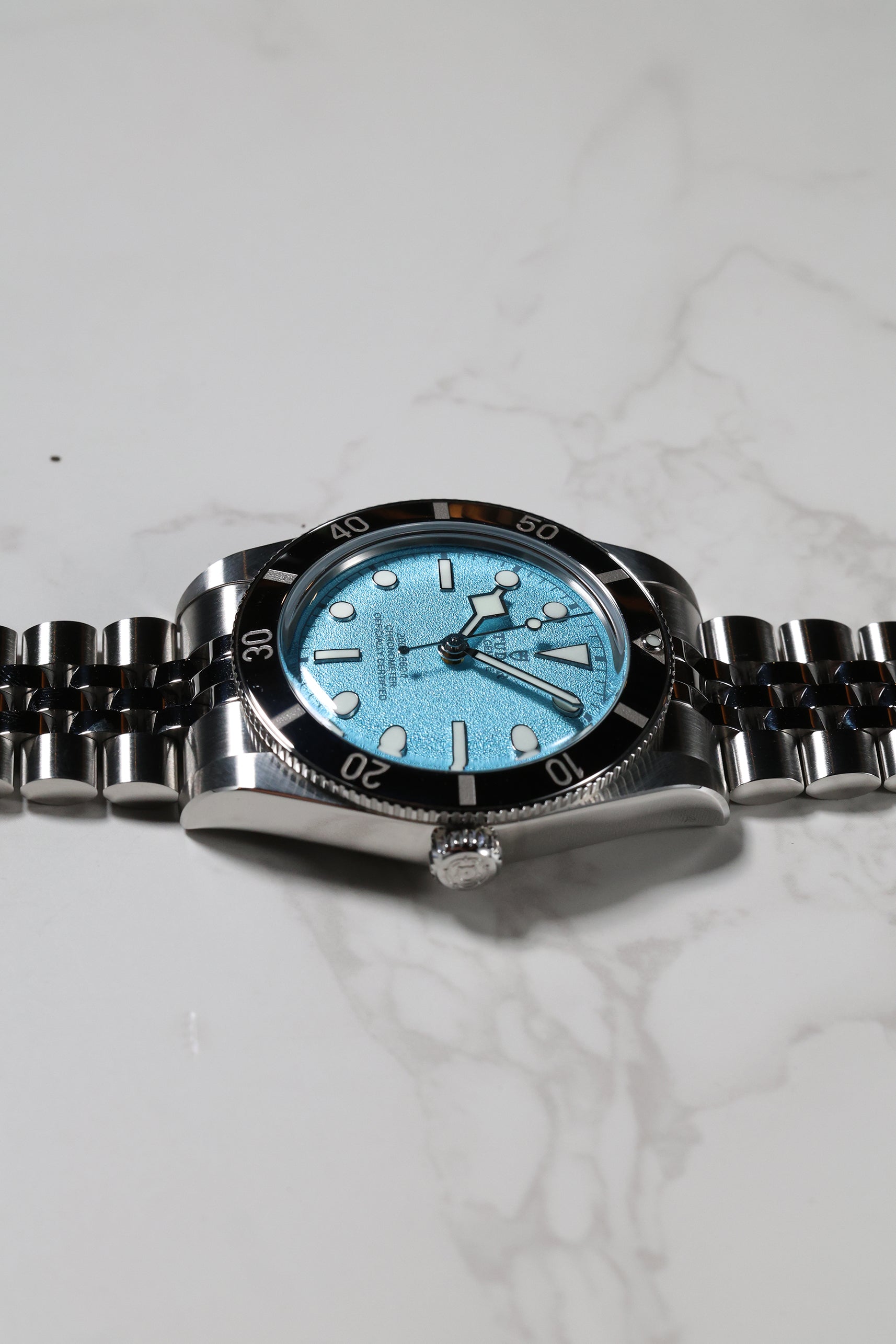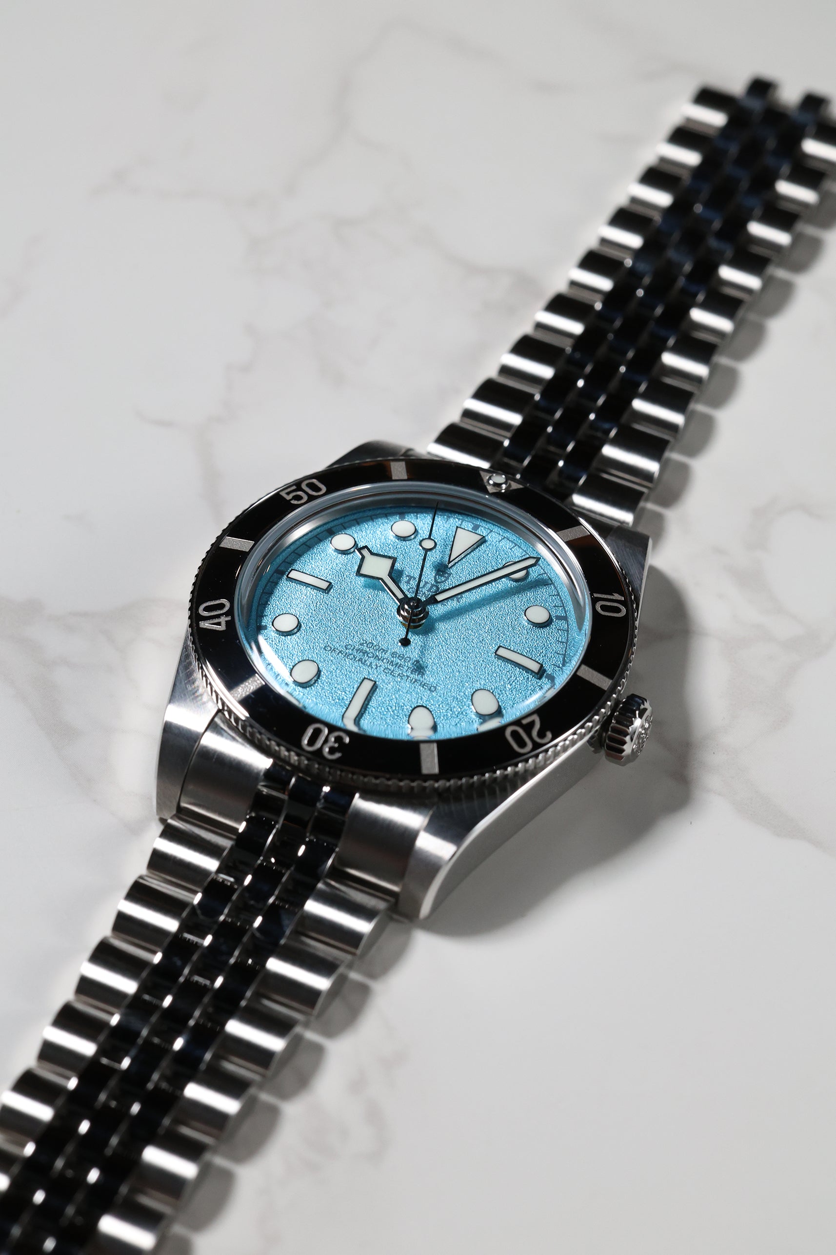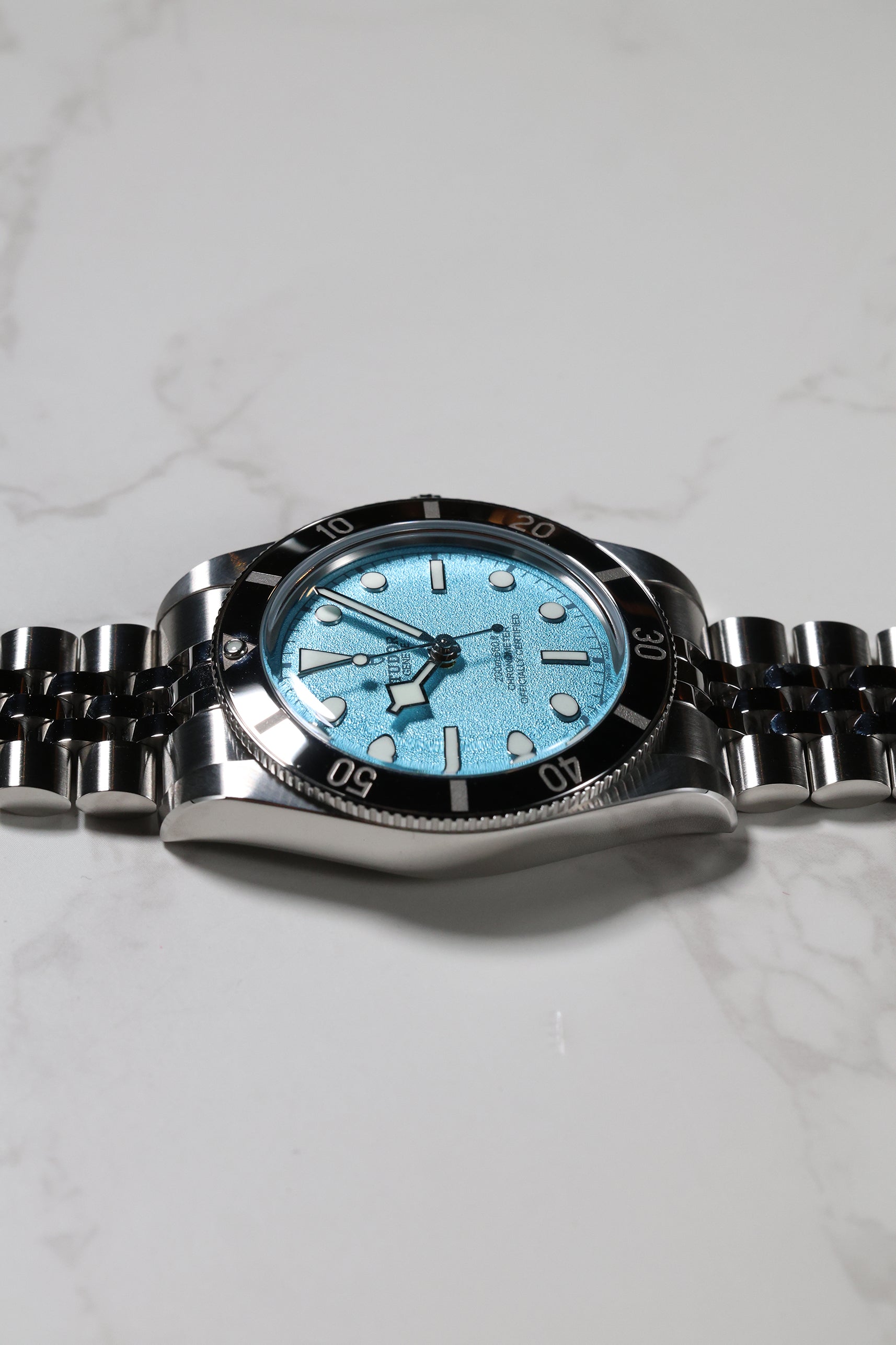 The defining feature of this "Blue Lagoon" edition is its captivating light blue textured dial. This vibrant surface subtly evokes the serene, crystal-clear waters of a pristine lagoon, playing beautifully with light to create a dynamic and inviting aesthetic. The dial retains quintessential Black Bay elements, boasting applied markers and iconic “snowflake” hands, all filled with bold white Super-LumiNova for exceptional legibility. The thoughtful omission of a date window keeps the dial symmetrical and true to its retro inspiration, reinforcing a pure dive-watch aesthetic that focuses on time itself.