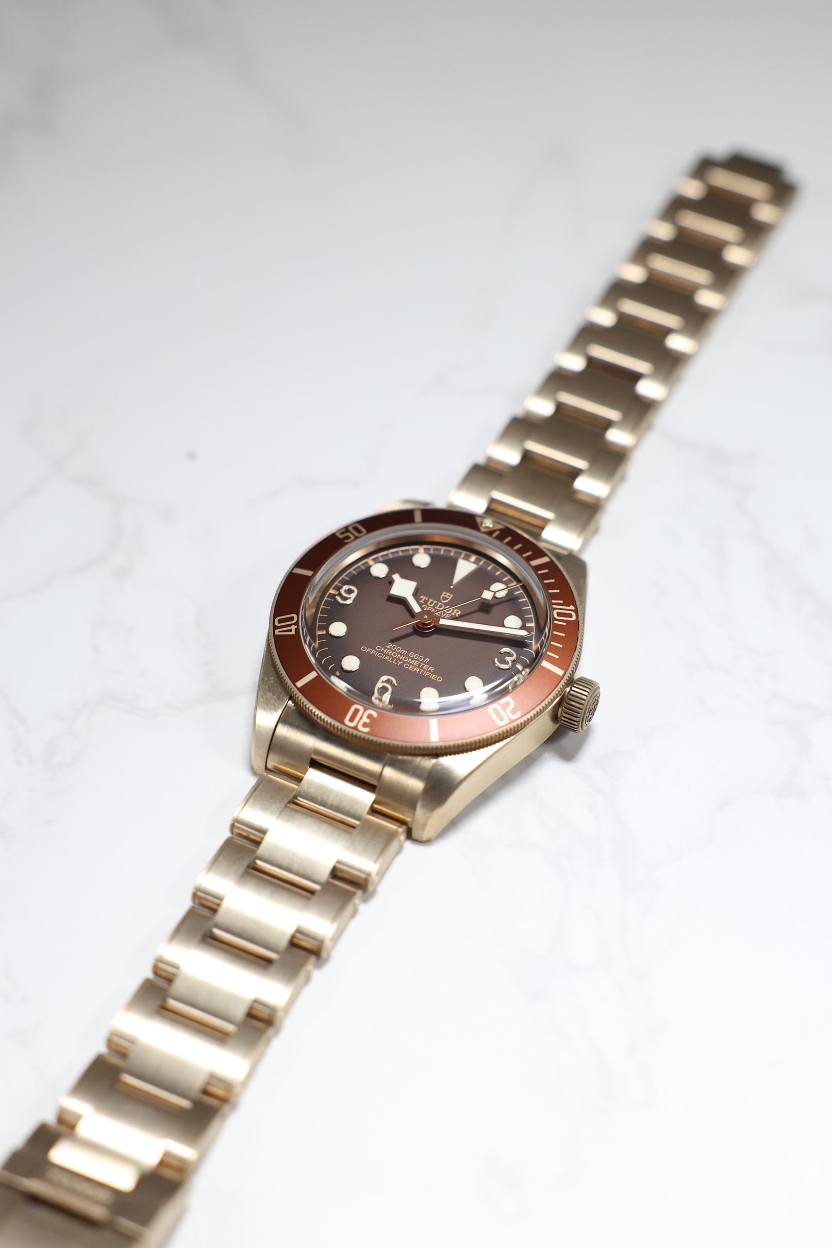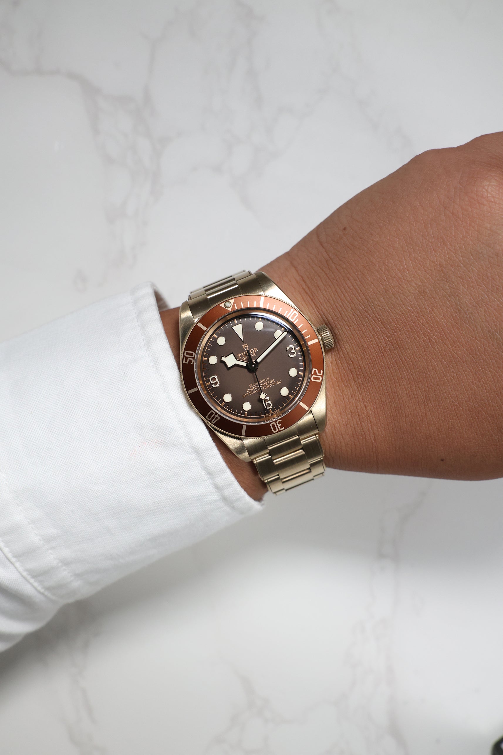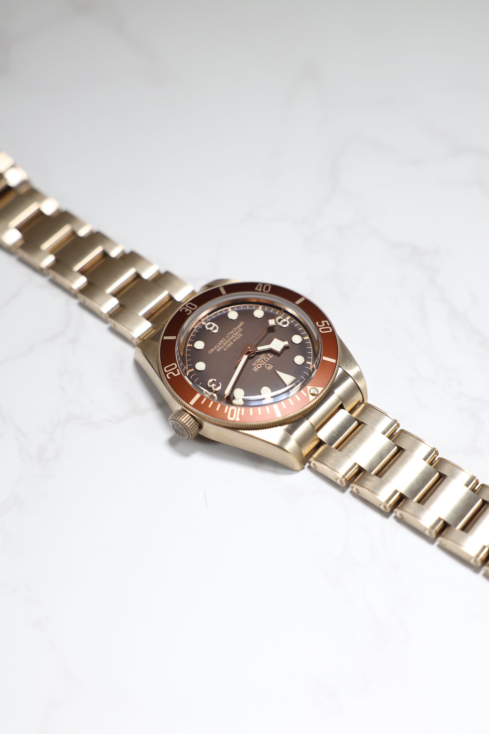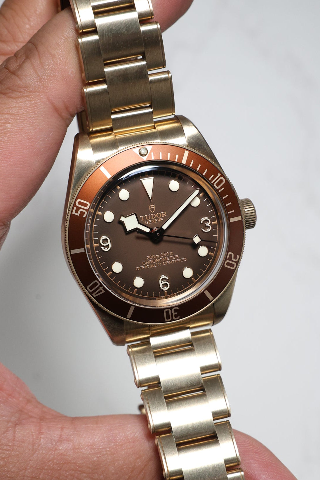 Crafted entirely from a satin-brushed aluminium bronze alloy, the case, unidirectional bezel, screw-down crown, and even the bracelet are all rendered in this warm, "living" metal. Chosen for its durability and its remarkable capacity to develop a unique patina over time, the matte finish enhances the vintage-inspired aesthetic. This ensures that each watch will take on a character entirely its own, maturing beautifully with every wear. The rich brown dial and matching bezel insert feature striking golden accents, directly echoing early Tudor dive models and offering strong contrast and warmth. True to Tudor form, legibility is exceptional, with large luminous hour markers and the signature "snowflake" hands standing out clearly.