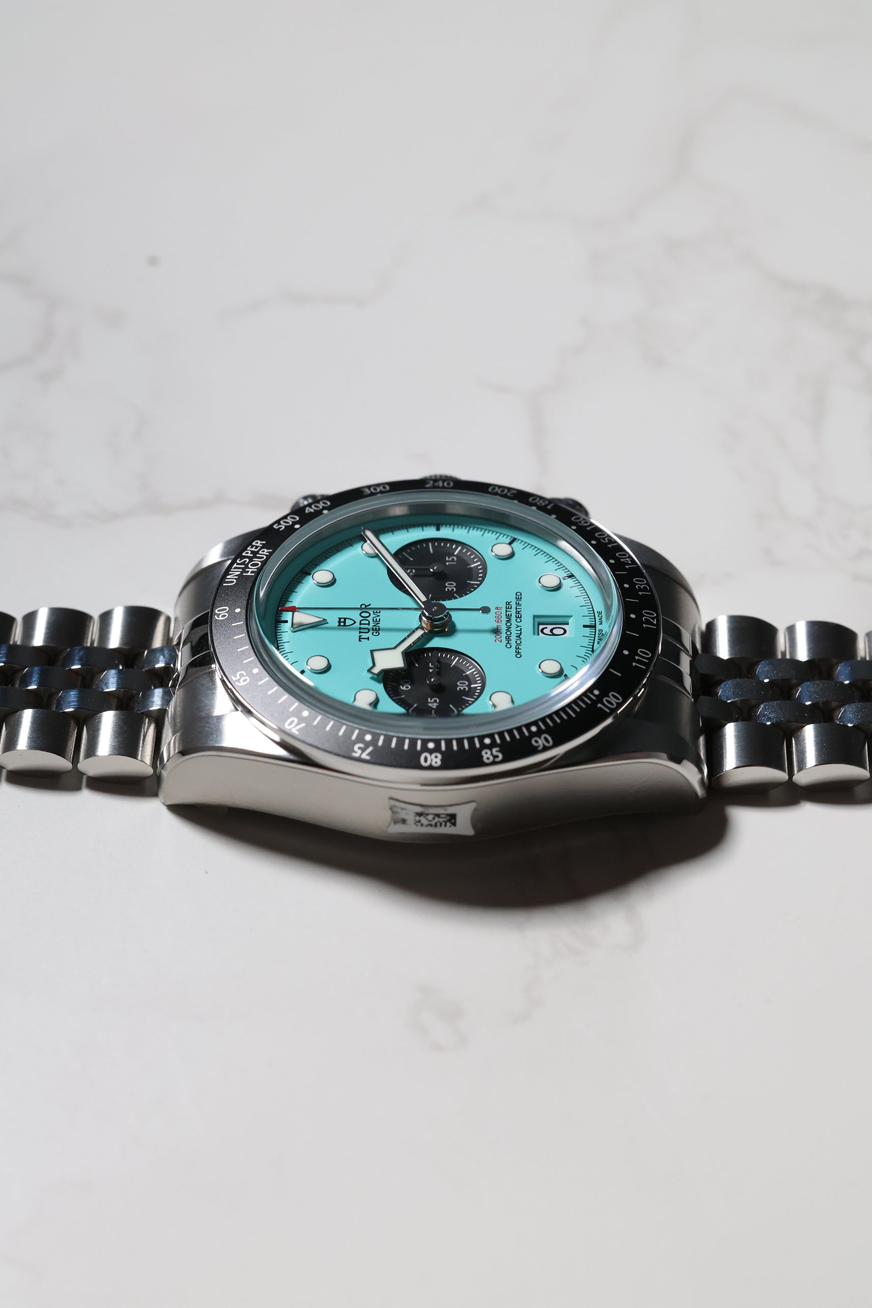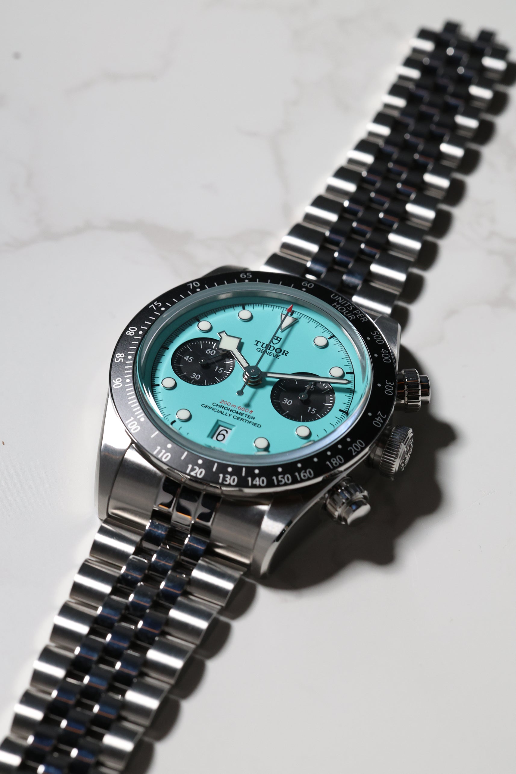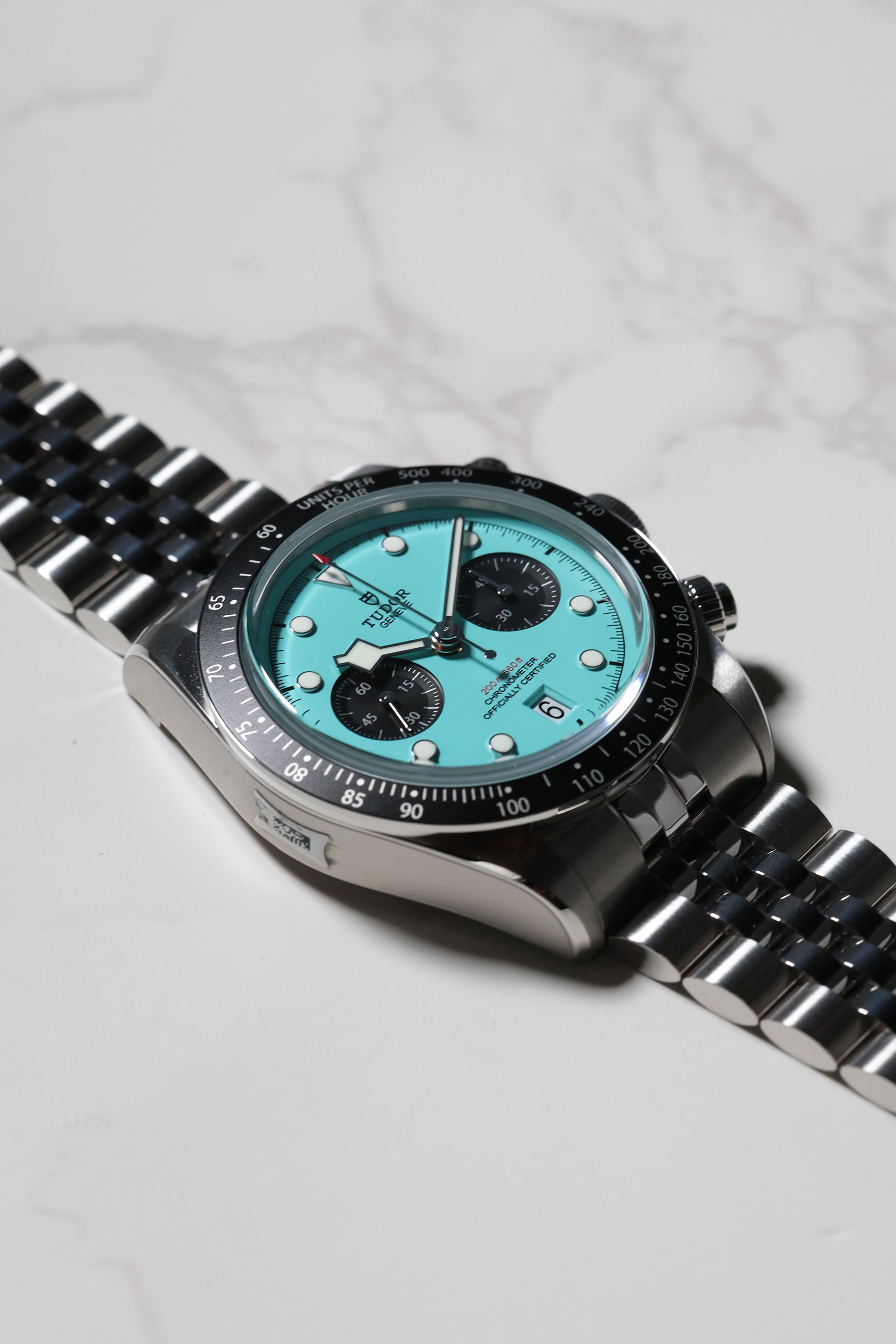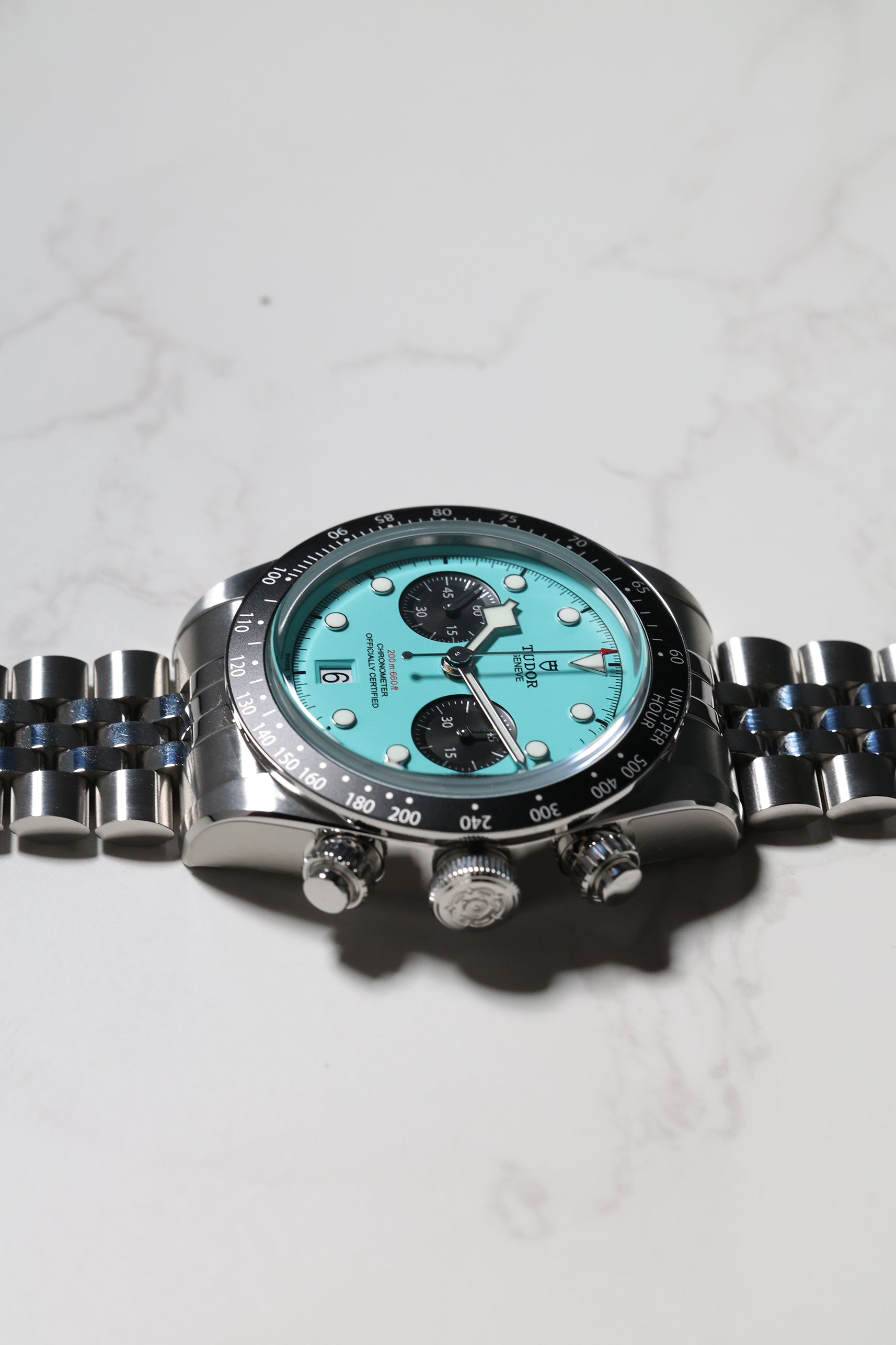 Introducing the Tudor Black Bay Chronograph 79360N in the captivating "Flamingo Blue" – a vibrant statement that injects a fresh wave of personality into the iconic Black Bay Chrono line. Debuting in January 2025, this striking timepiece boldly steps away from traditional chronograph aesthetics with its mesmerizing turquoise dial, reminiscent of sun-drenched tropical waters. For those who appreciate heritage but aren't afraid to express their individuality, this chronograph is a confident choice.