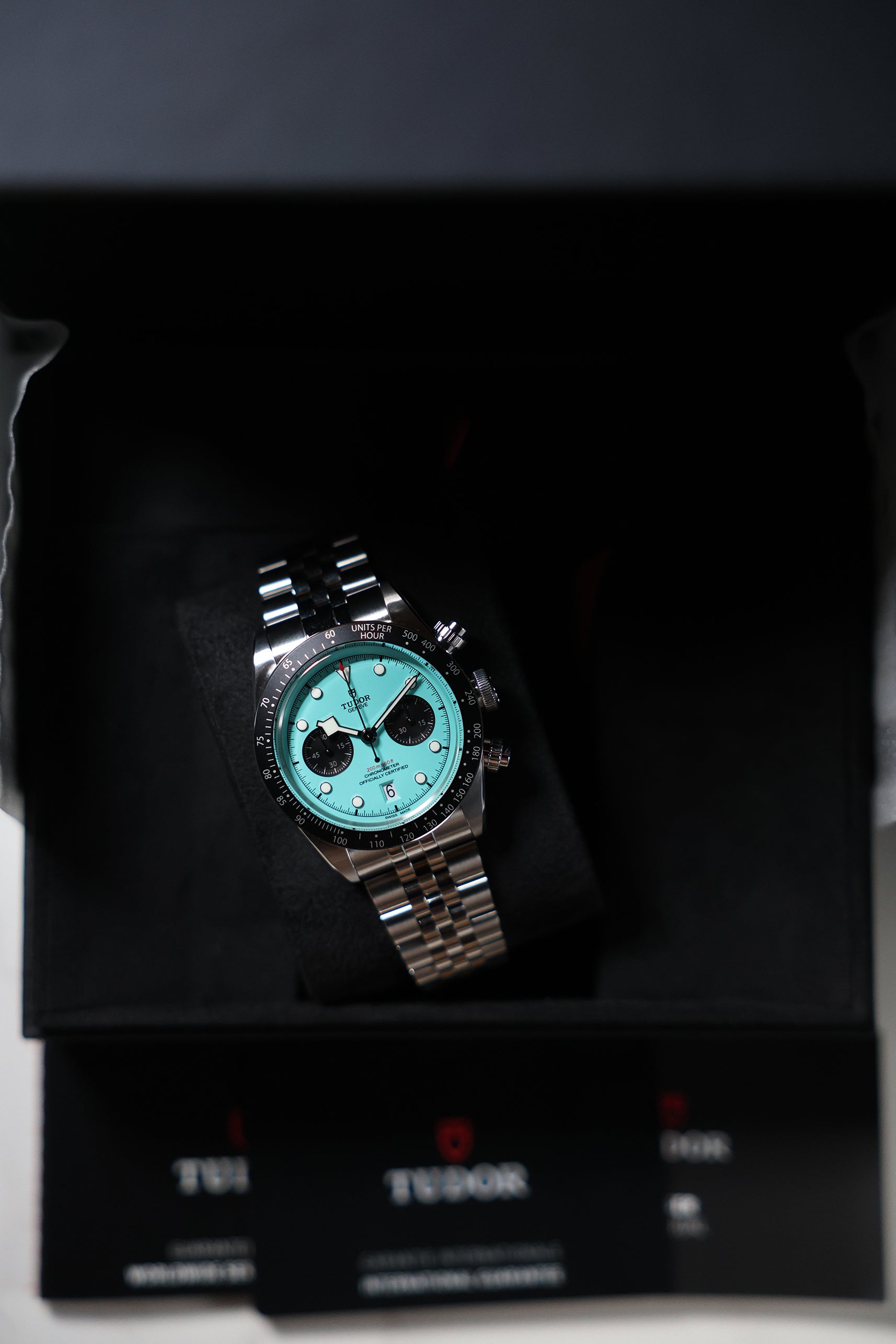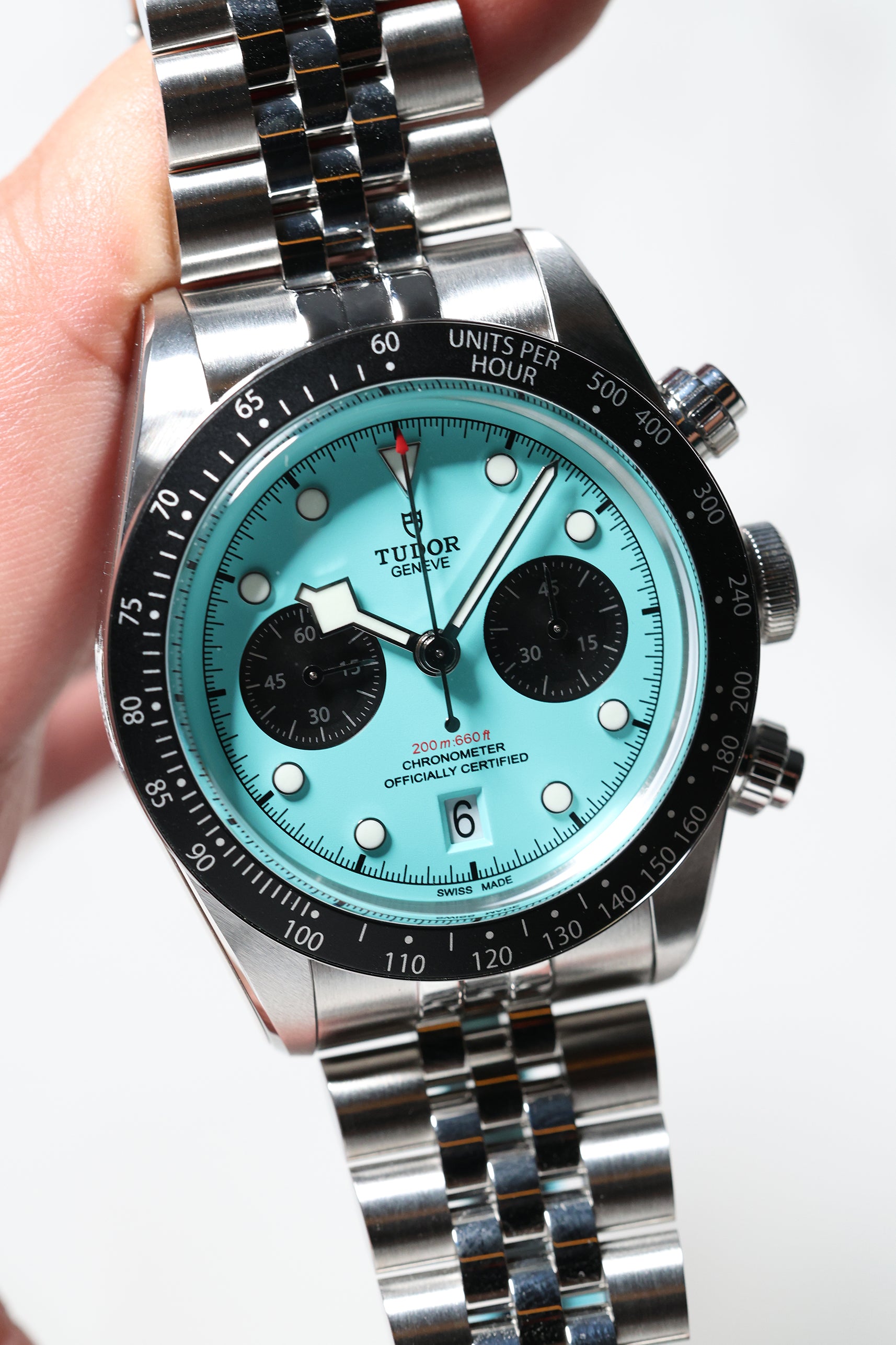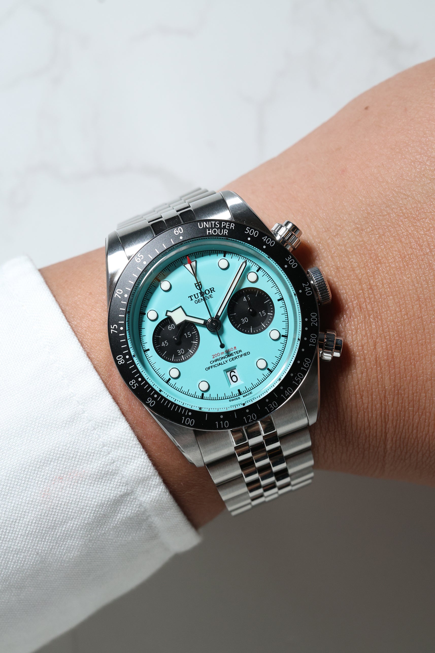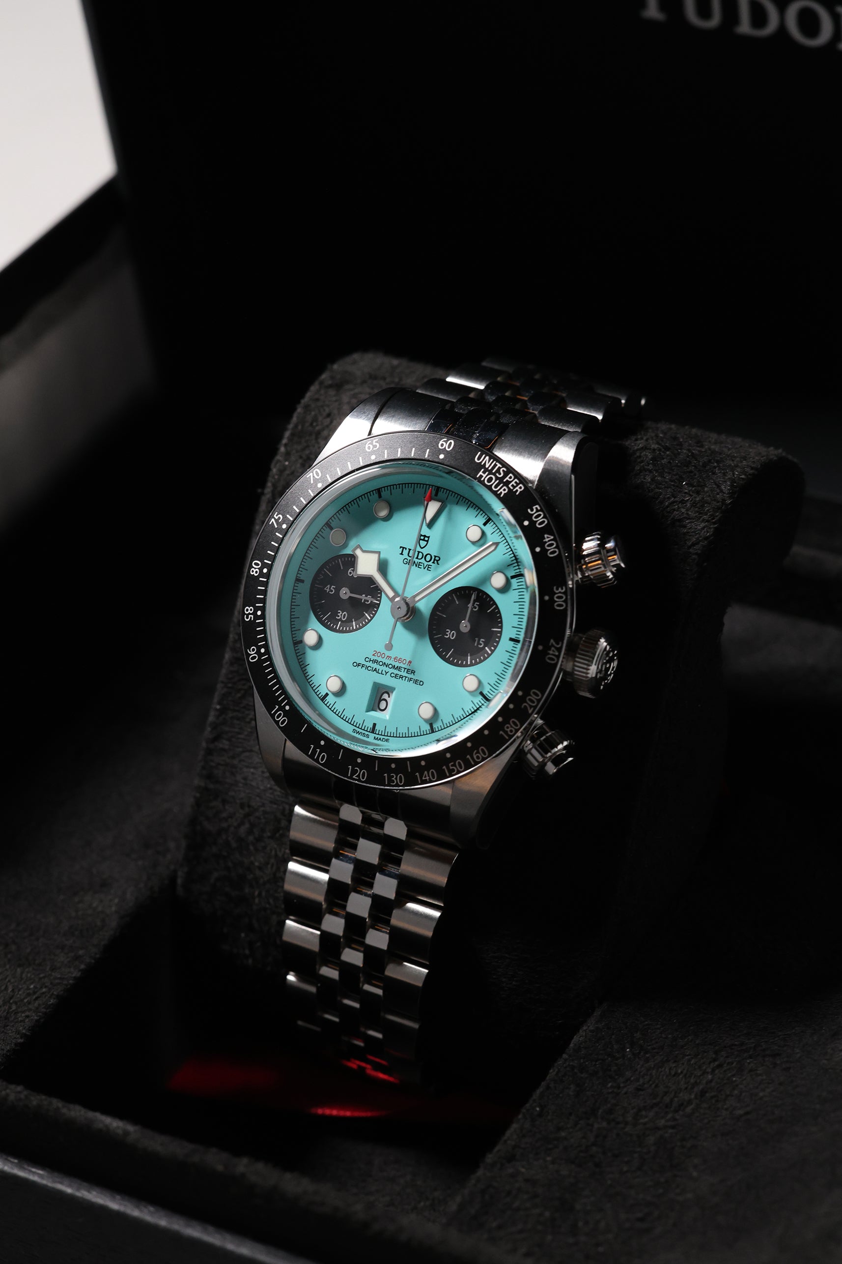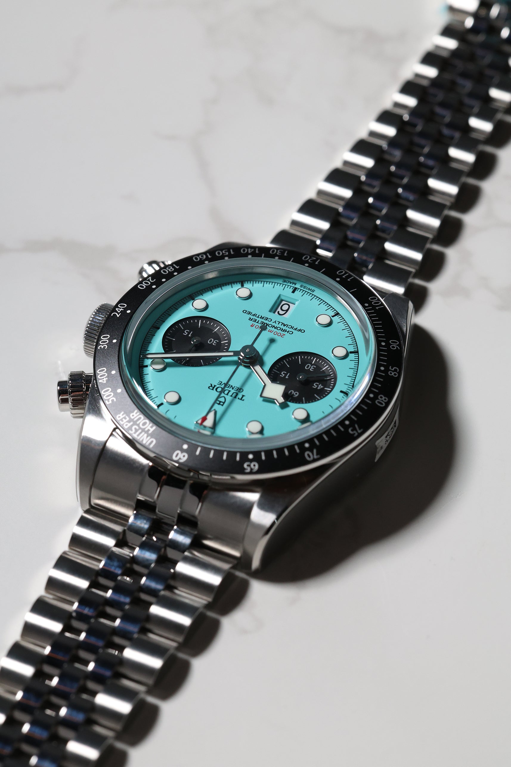 Introducing the Tudor Black Bay Chronograph 79360N in the captivating "Flamingo Blue" – a vibrant statement that injects a fresh wave of personality into the iconic Black Bay Chrono line. Debuting in January 2025, this striking timepiece boldly steps away from traditional chronograph aesthetics with its mesmerizing turquoise dial, reminiscent of sun-drenched tropical waters. For those who appreciate heritage but aren't afraid to express their individuality, this chronograph is a confident choice.