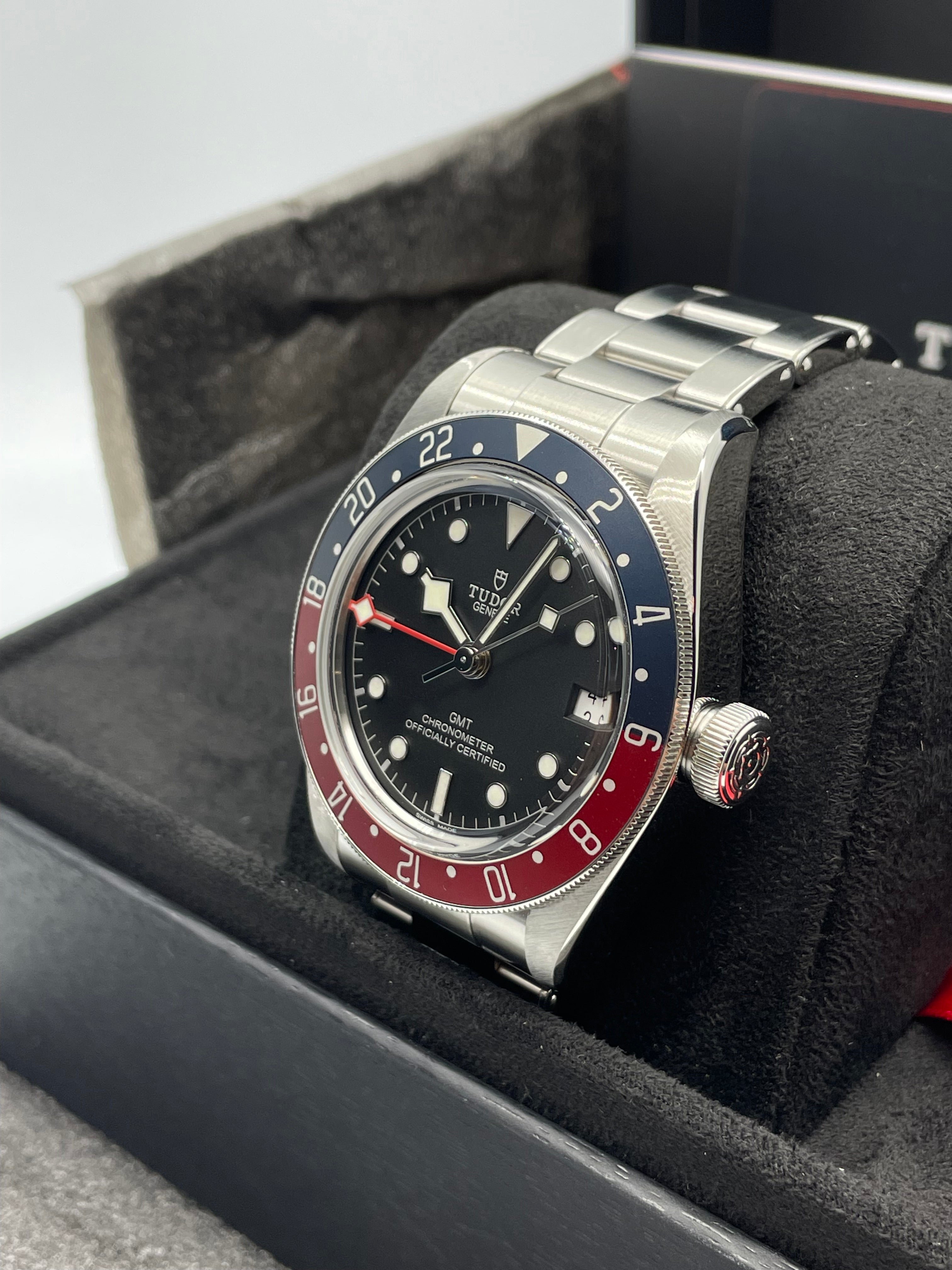 The matte black dial is a study in understated elegance, featuring Tudor’s signature snowflake hands and bold hour markers filled with luminous material for exceptional legibility in low-light conditions. The red and blue bezel insert not only adds a vibrant pop of color but also enhances the watch’s practicality, making it easy to distinguish between day and night hours. The red GMT hand, with its sharp arrow tip, stands out against the dial, ensuring clear readability of the second time zone. Every detail is designed with purpose, staying true to Tudor’s commitment to both style and functionality.