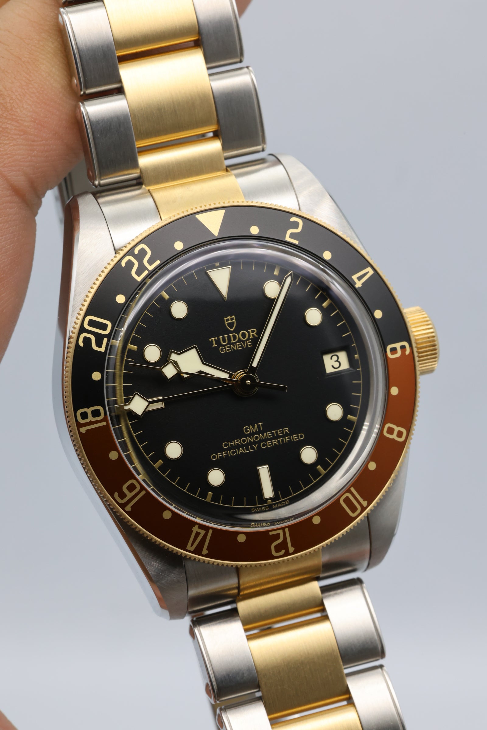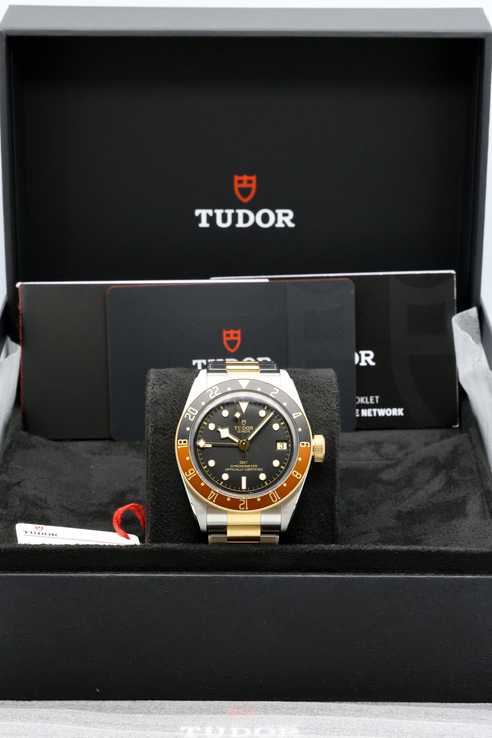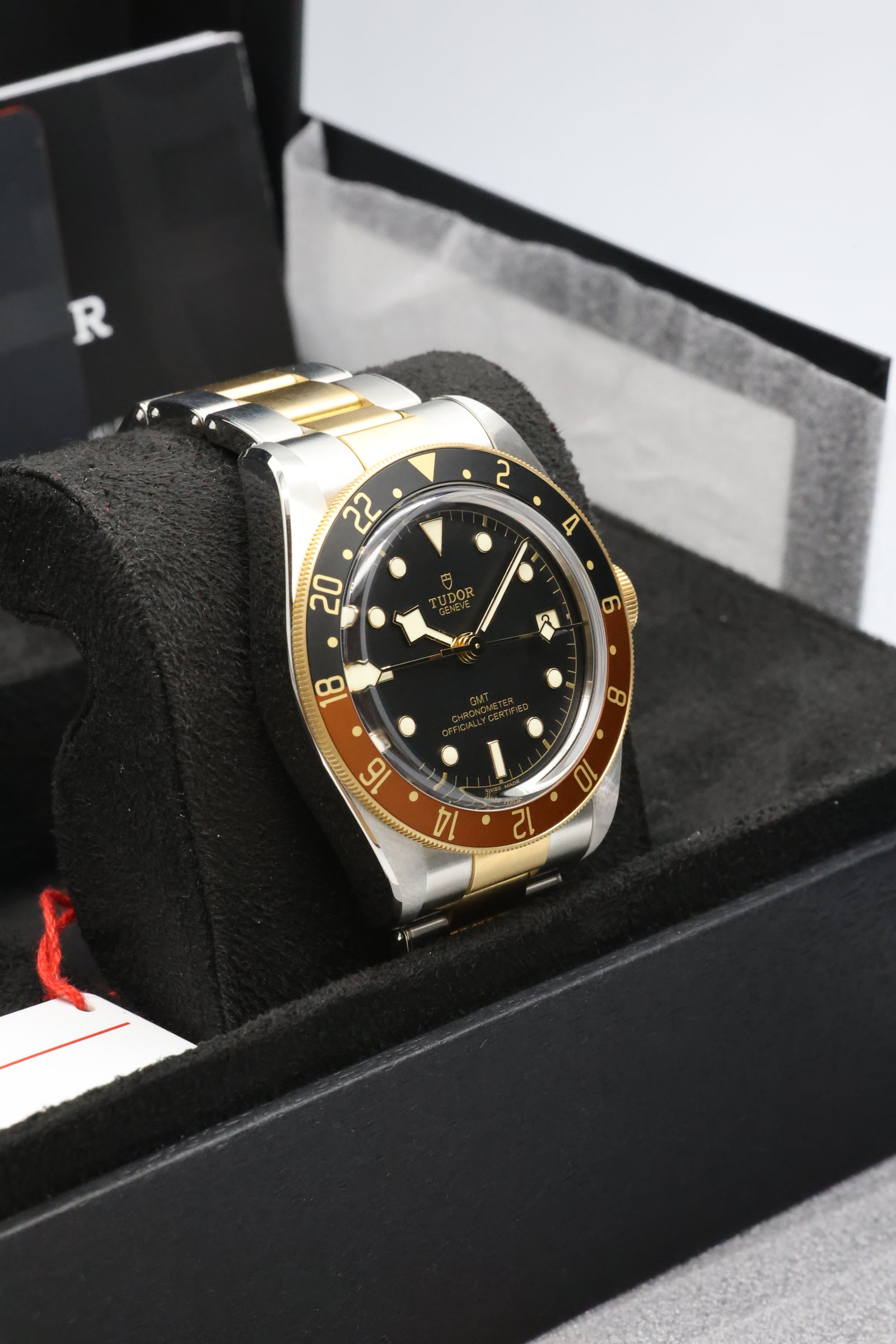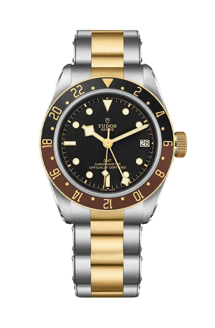 The Tudor Black Bay GMT Steel & Gold 79833MN is a striking take on the classic dual-time travel watch, blending the practicality of a GMT complication with the sophistication of a two-tone design. Its 41mm stainless steel case is complemented by luxurious 18k yellow gold accents on the bezel, crown, and bracelet center links, adding a touch of opulence to the rugged Black Bay aesthetic. The bezel, featuring a matte brown and black aluminum insert, distinguishes this model from other GMTs, giving it a warm, vintage-inspired look that is both unique and timeless.