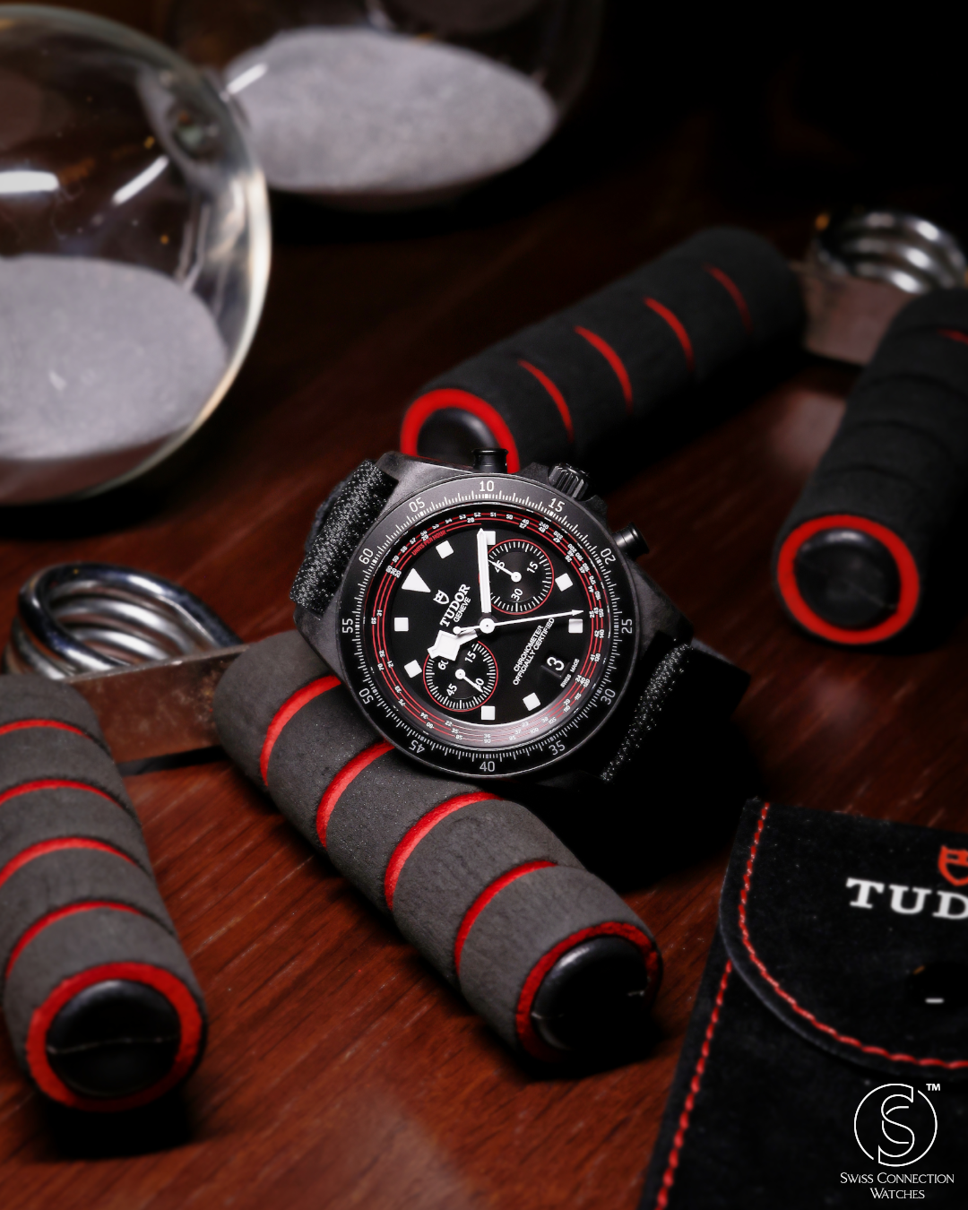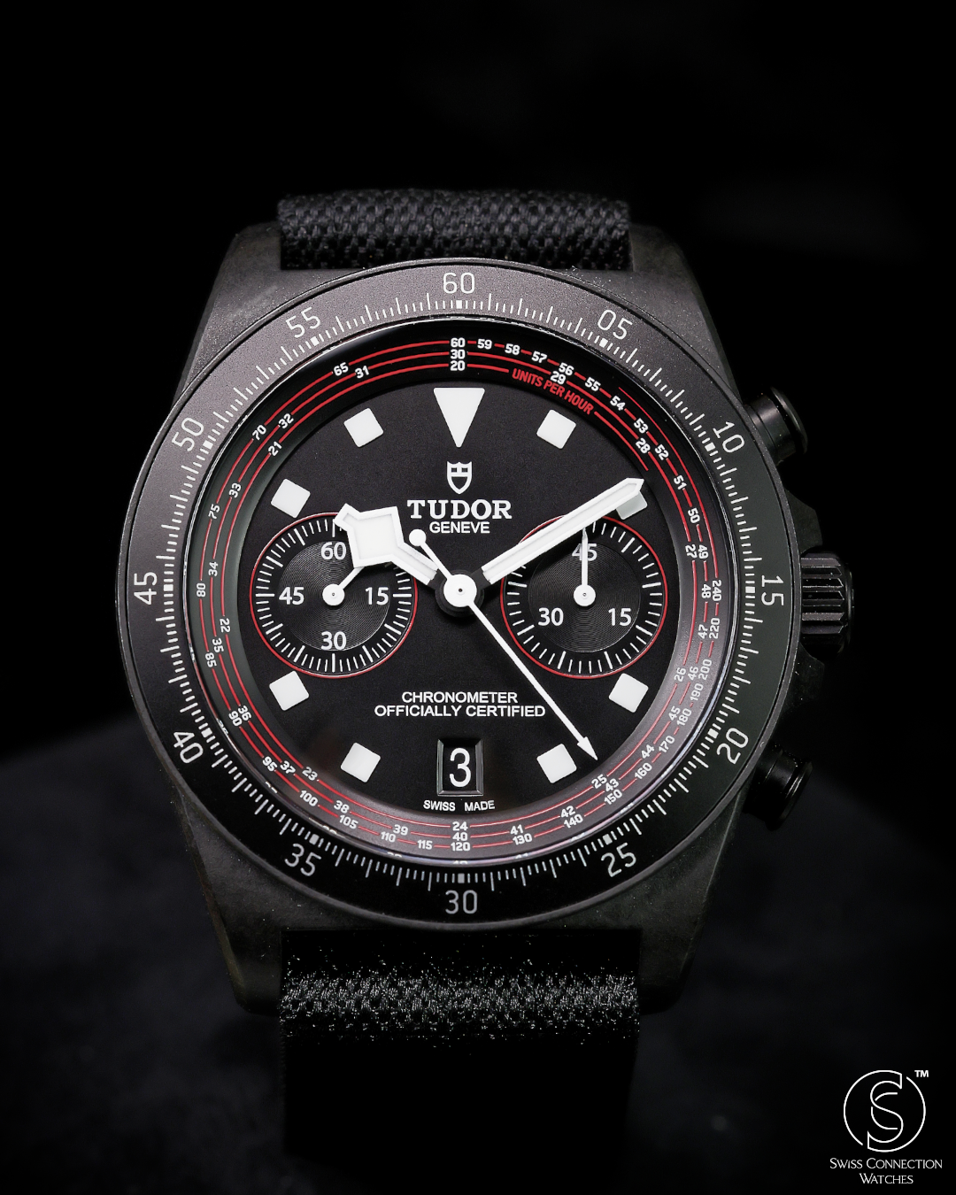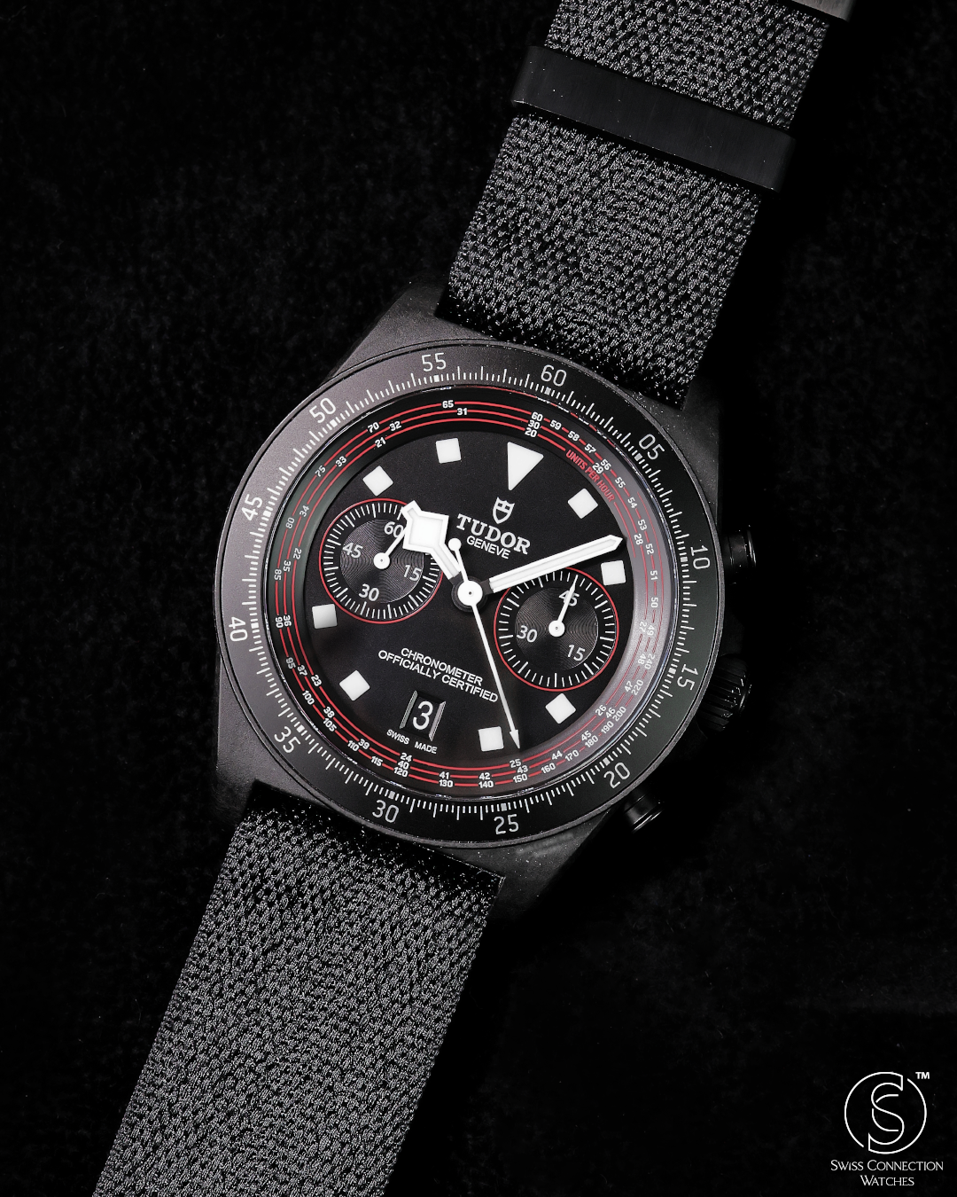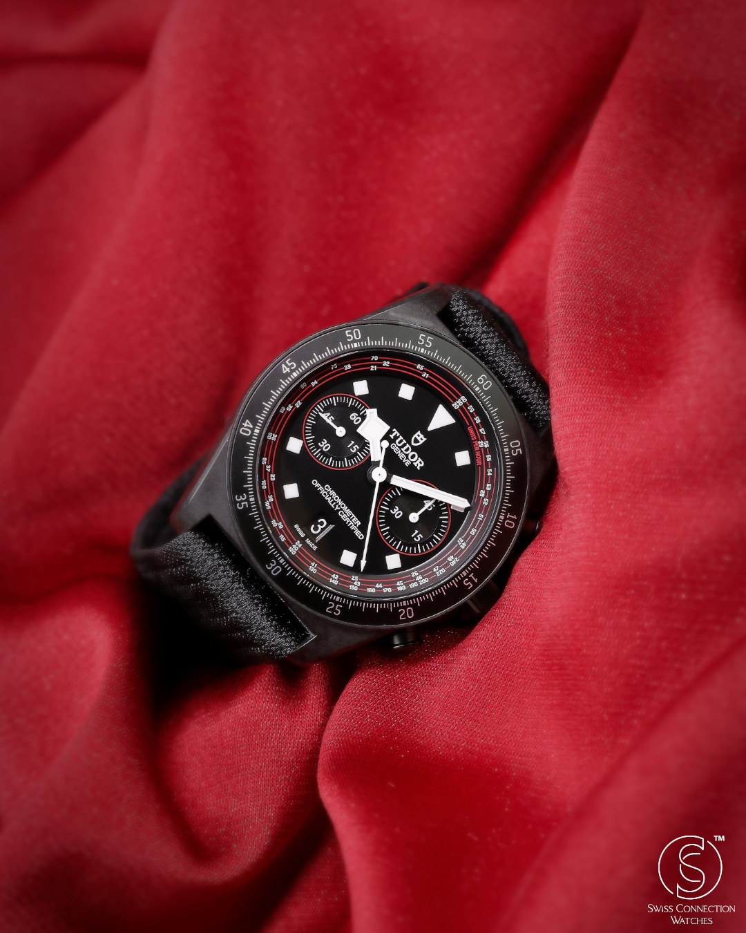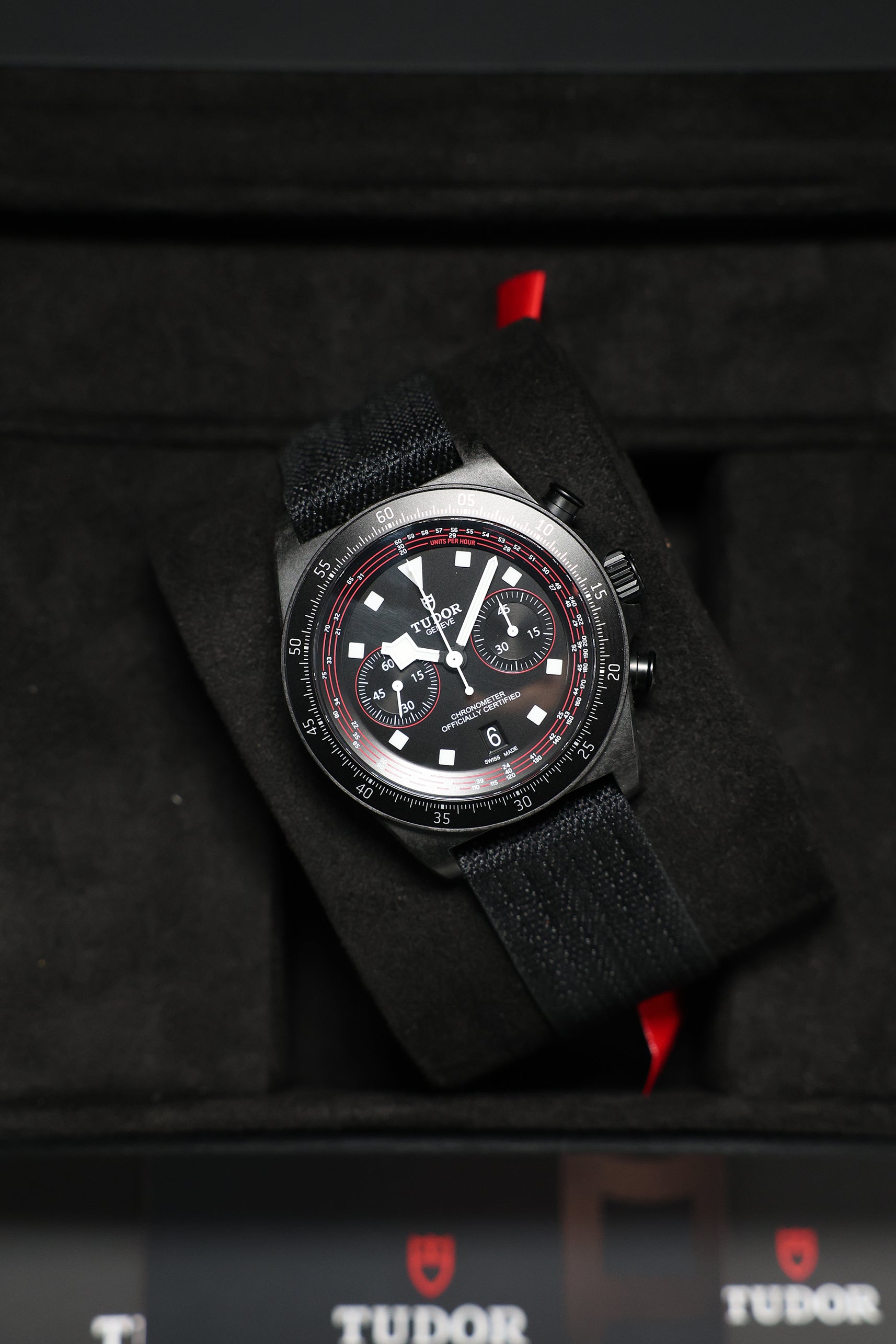 The matte black dial is meticulously crafted with clarity and legibility as its primary focus. It features high-contrast red accents that directly echo the dynamic racing colors of the TUDOR Pro Cycling Team. The bi-compax layout includes a precise 45-minute chronograph counter—ideal for timing competitive cycling intervals—alongside running seconds. Signature snowflake hands and bold hour markers are generously filled with Super-LumiNova, ensuring exceptional visibility in varying light conditions. A tachymeter scale, subtly printed on the fixed carbon bezel, adds a final, functional nod to high-speed sport.