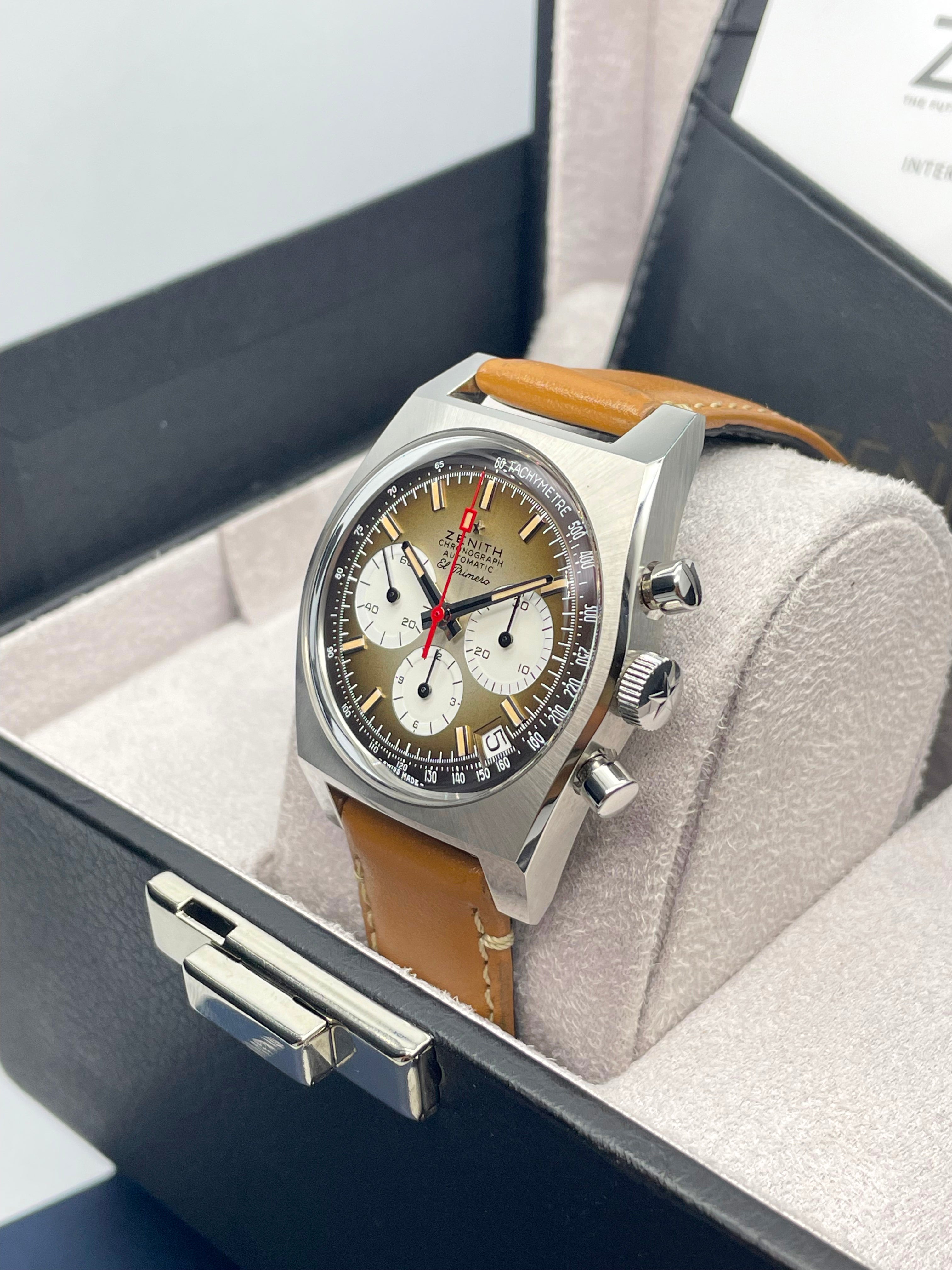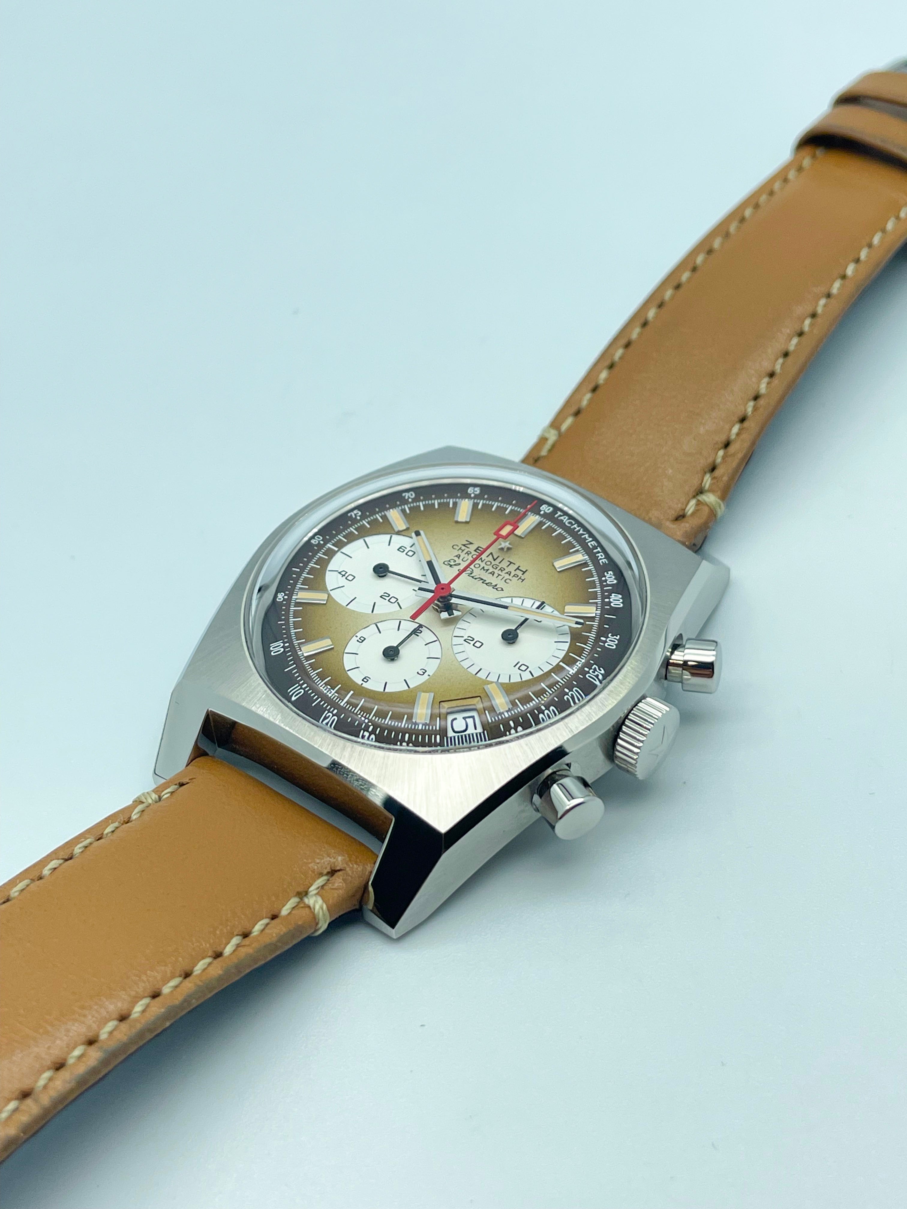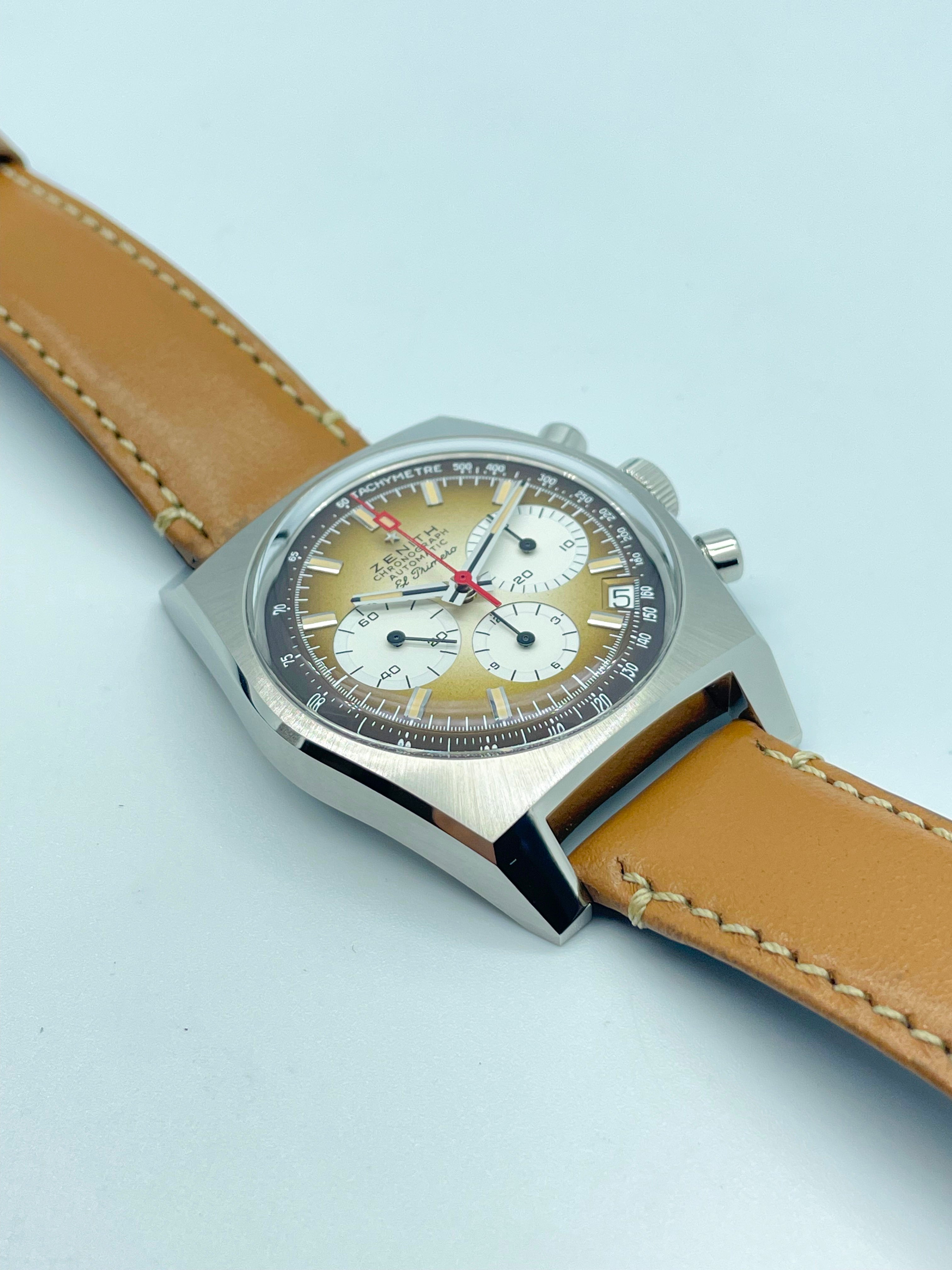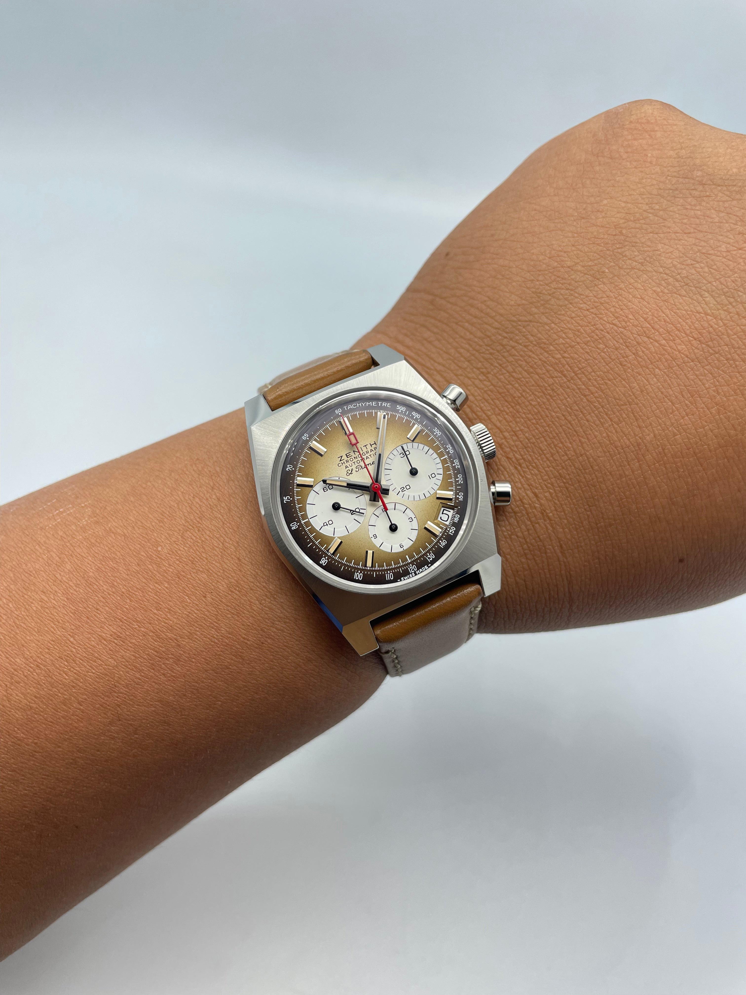 Completing the look is a light brown calfskin leather strap, which perfectly complements the warm tones of the dial and adds a touch of casual elegance. Over time, the leather will develop a unique patina, enhancing the watch’s vintage appeal. With its rich history, timeless design, and cutting-edge movement, the Zenith Chronomaster Revival El Primero A385 is a perfect blend of heritage and modern innovation, making it a must-have for collectors and enthusiasts who appreciate historically significant timepieces.