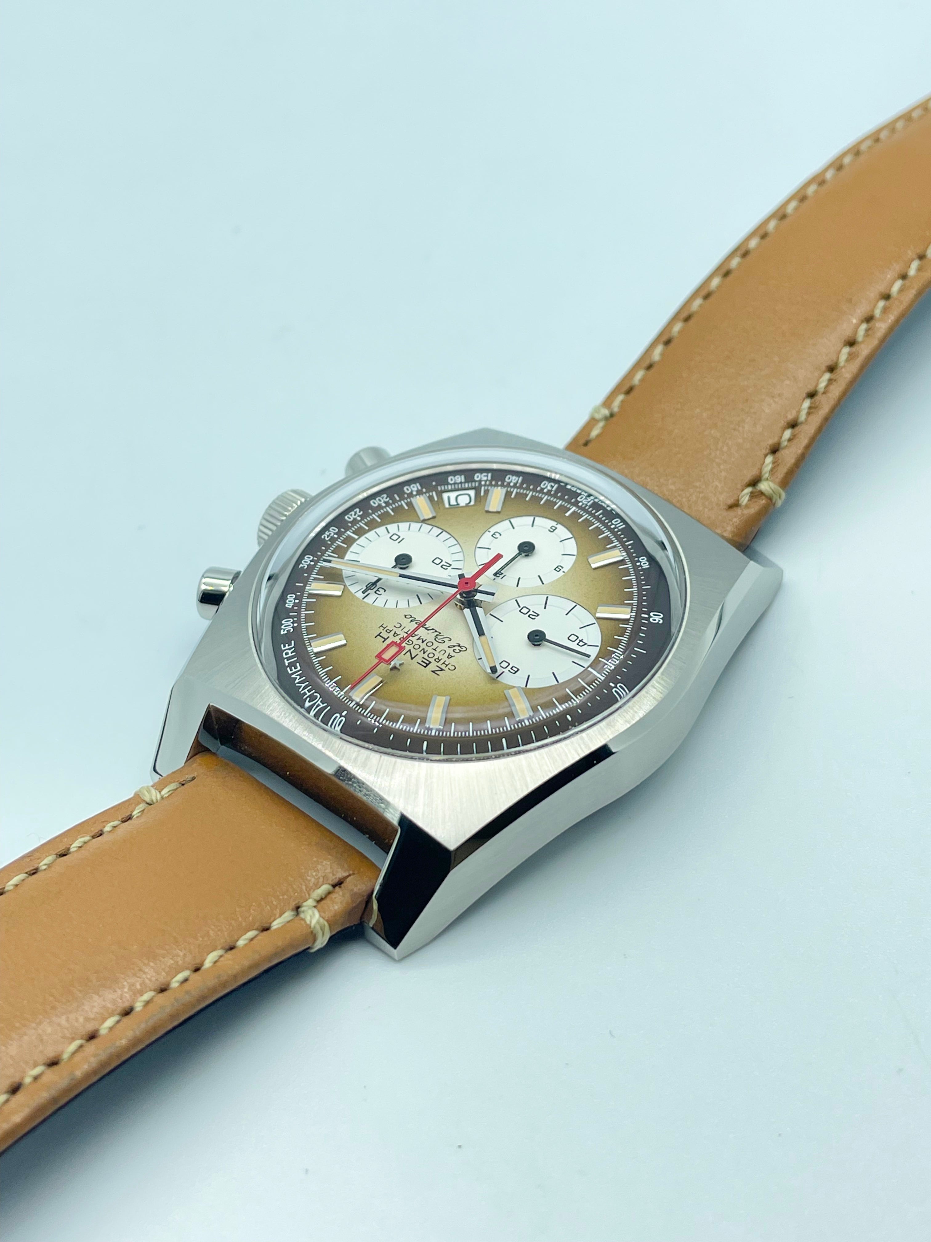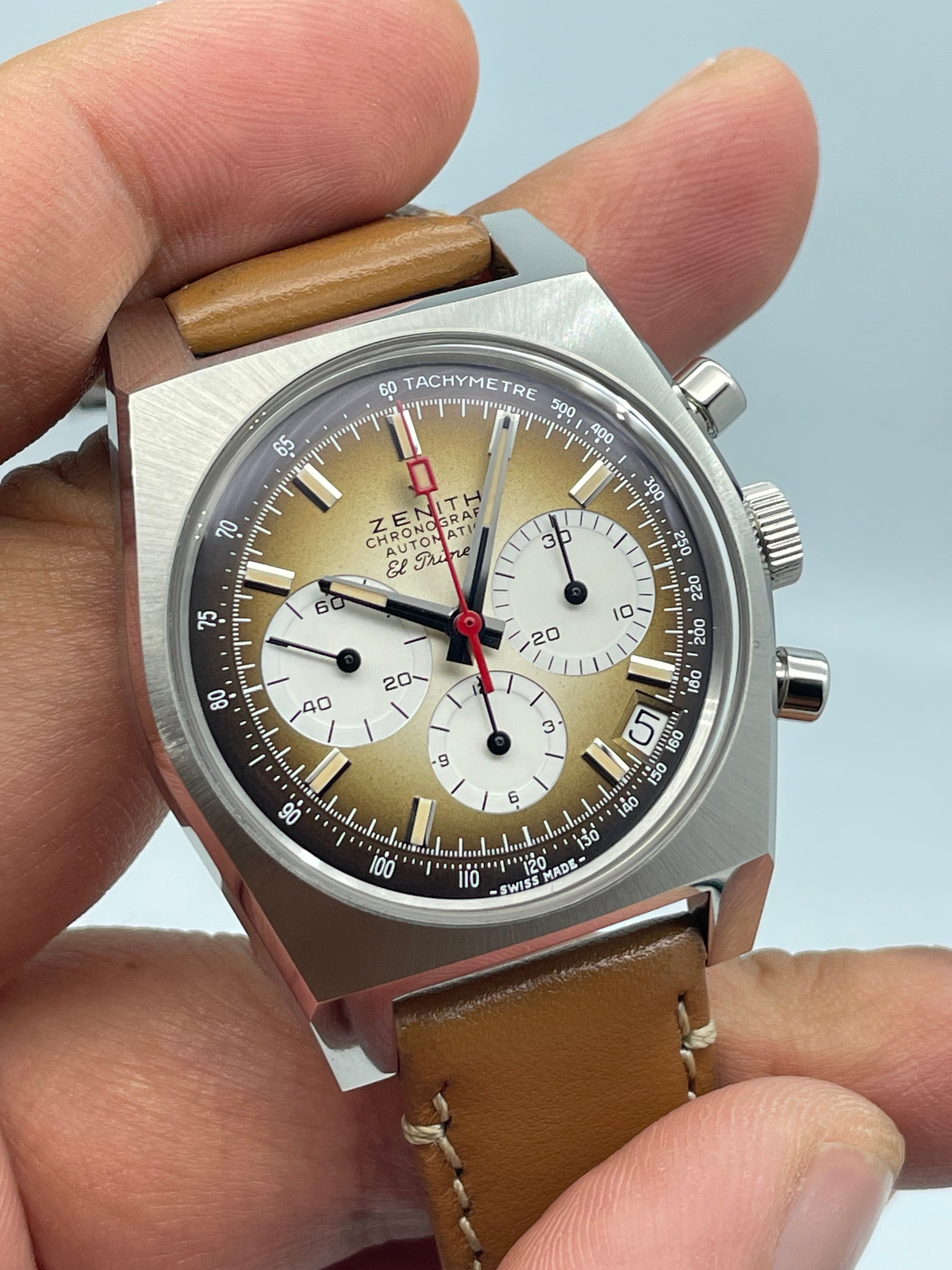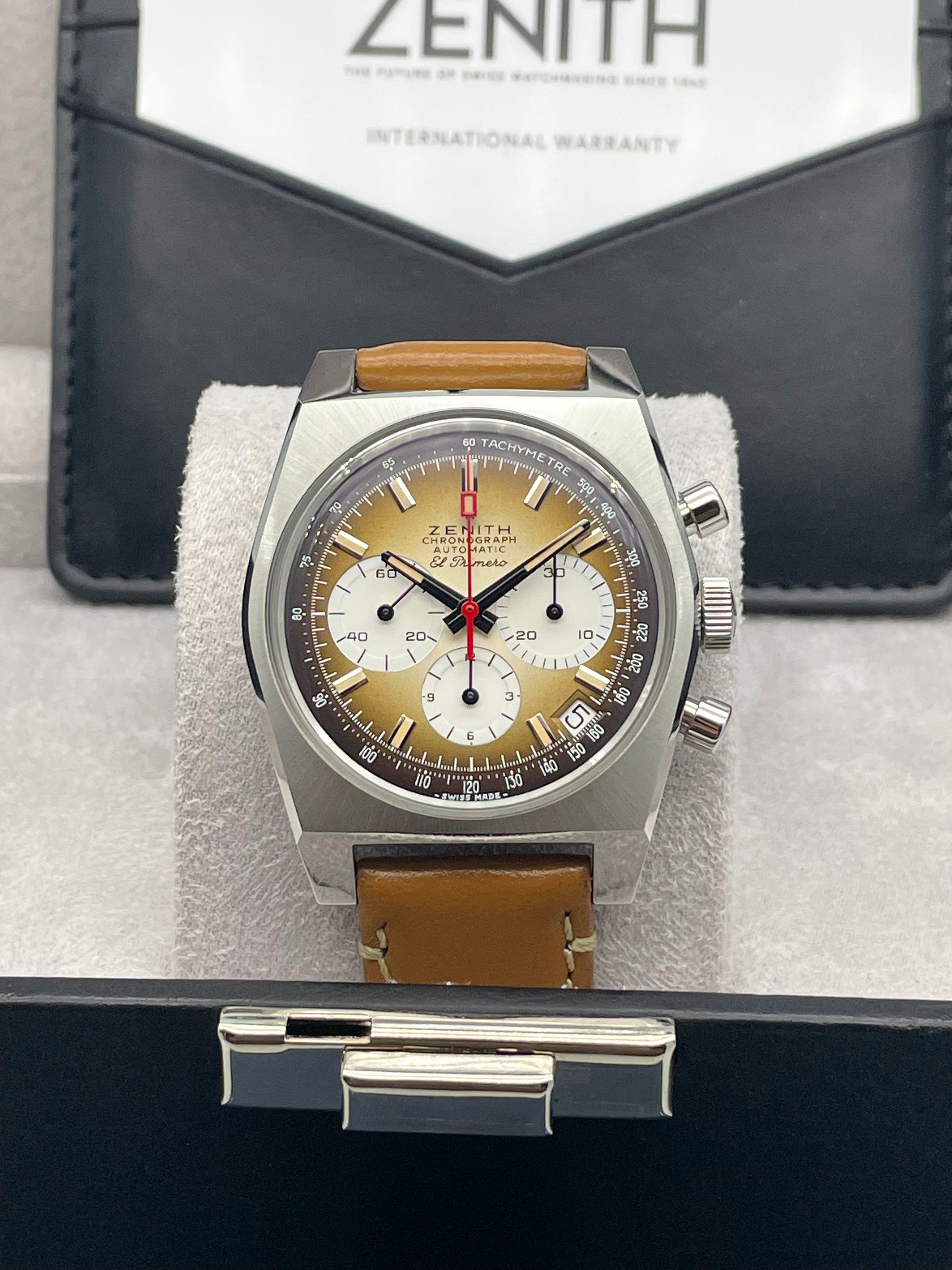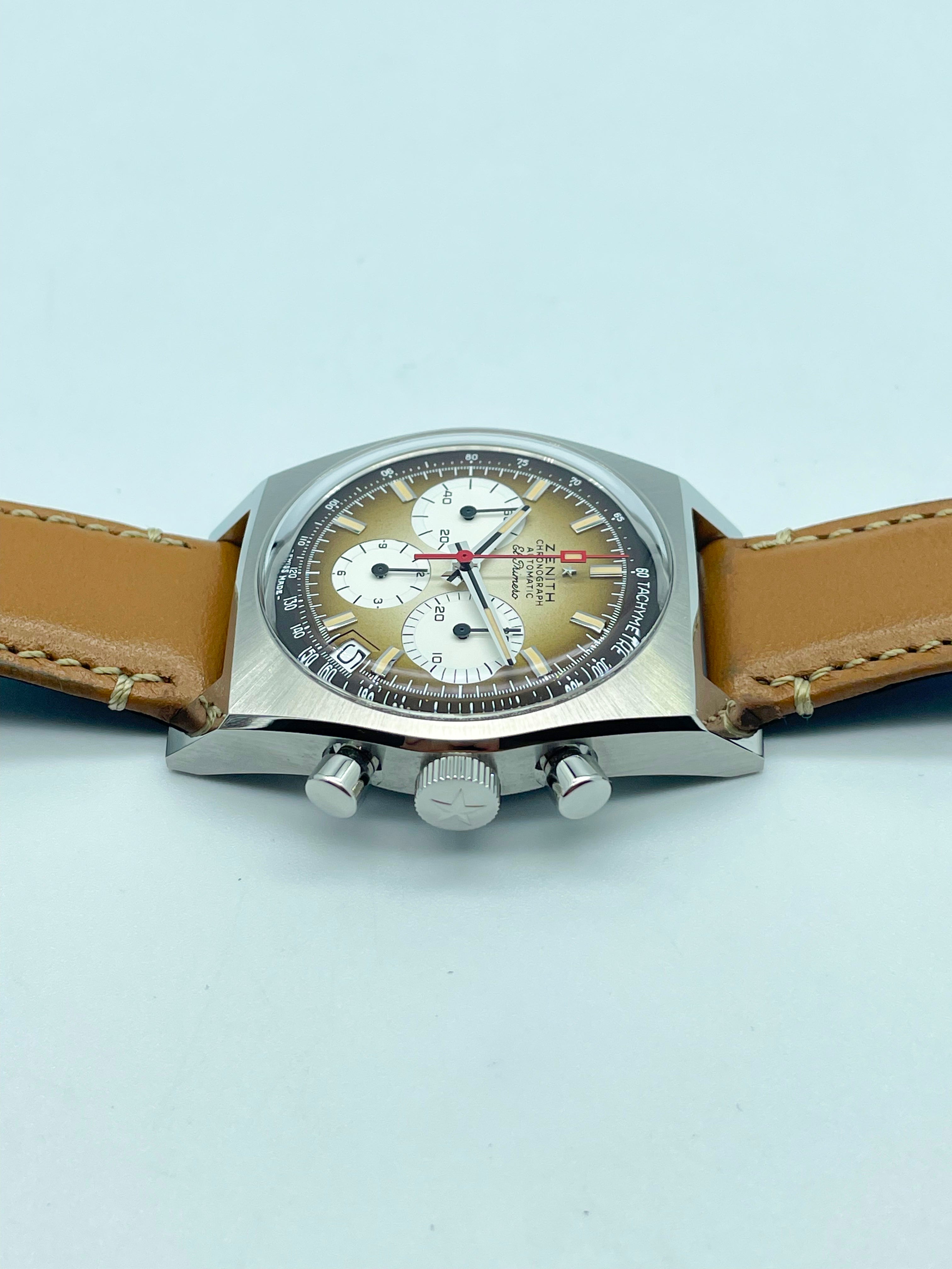Completing the look is a light brown calfskin leather strap, which perfectly complements the warm tones of the dial and adds a touch of casual elegance. Over time, the leather will develop a unique patina, enhancing the watch’s vintage appeal. With its rich history, timeless design, and cutting-edge movement, the Zenith Chronomaster Revival El Primero A385 is a perfect blend of heritage and modern innovation, making it a must-have for collectors and enthusiasts who appreciate historically significant timepieces.