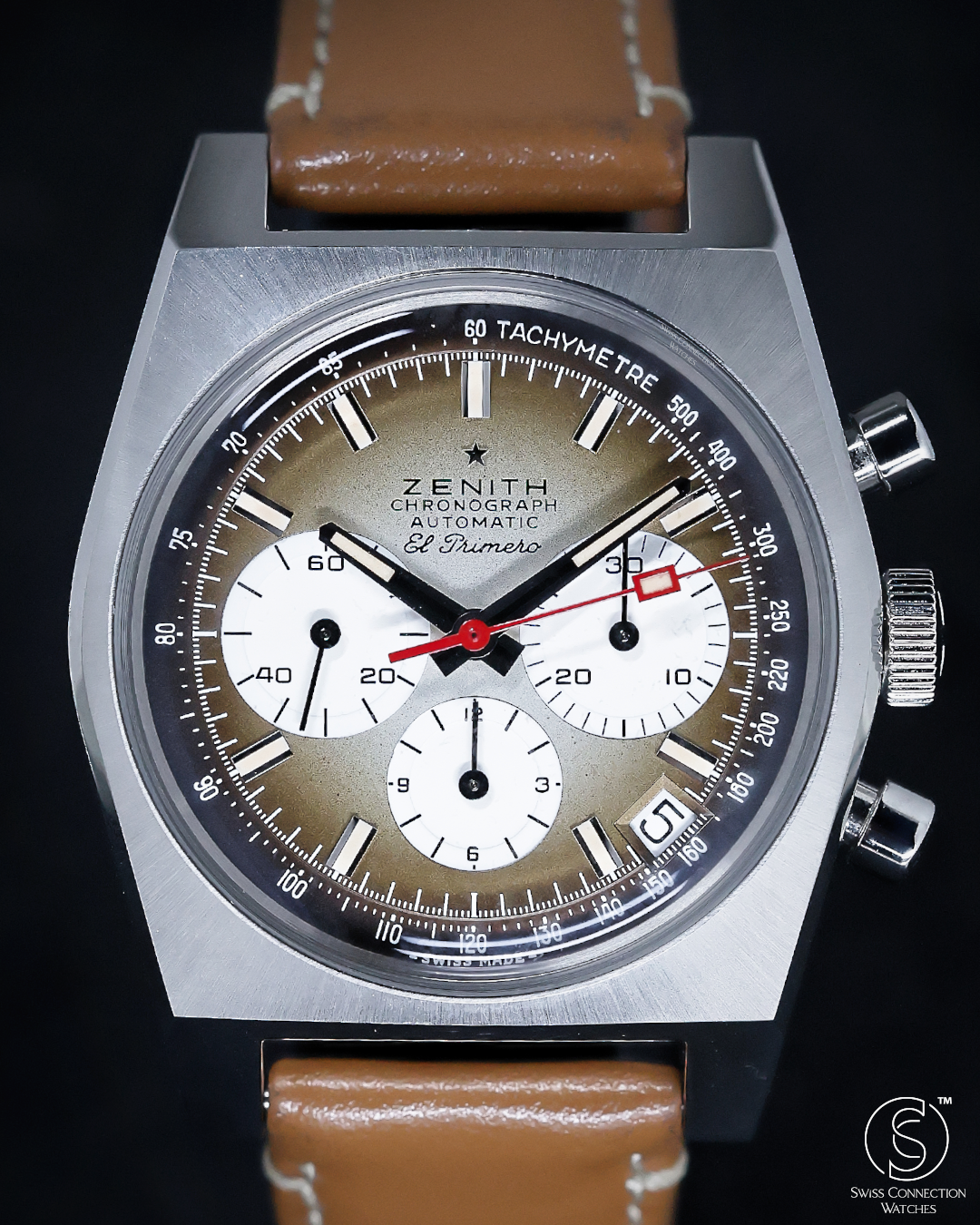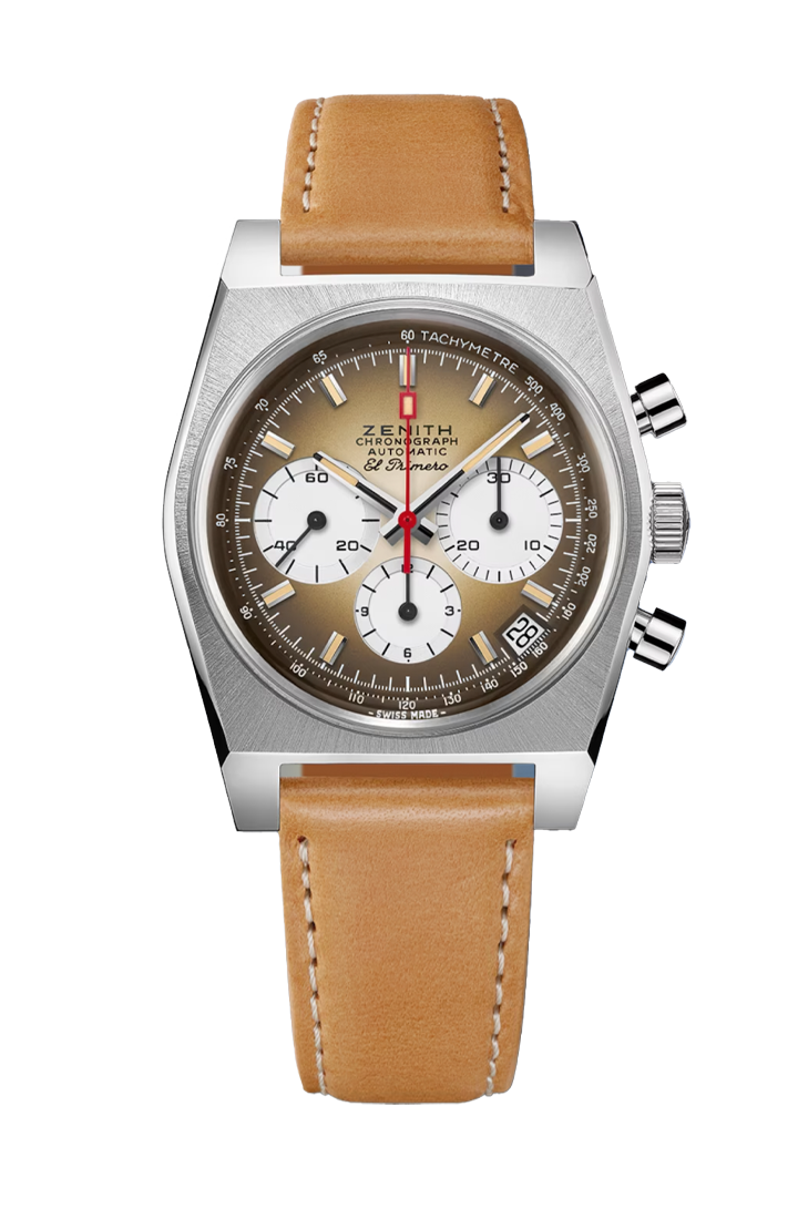 The gradient brown dial is one of the defining features of the A385, making it a standout piece in Zenith’s extensive chronograph history. This dial transitions from a rich brown center to a darker outer edge, creating a striking vignette effect that adds depth and dimension. The white subdials at 3, 6, and 9 o’clock contrast beautifully against the dial’s warm tones, ensuring optimal legibility. The red central chronograph seconds hand injects a sporty flair, while the tachymeter scale on the outer ring reinforces the watch’s precision timing capabilities.